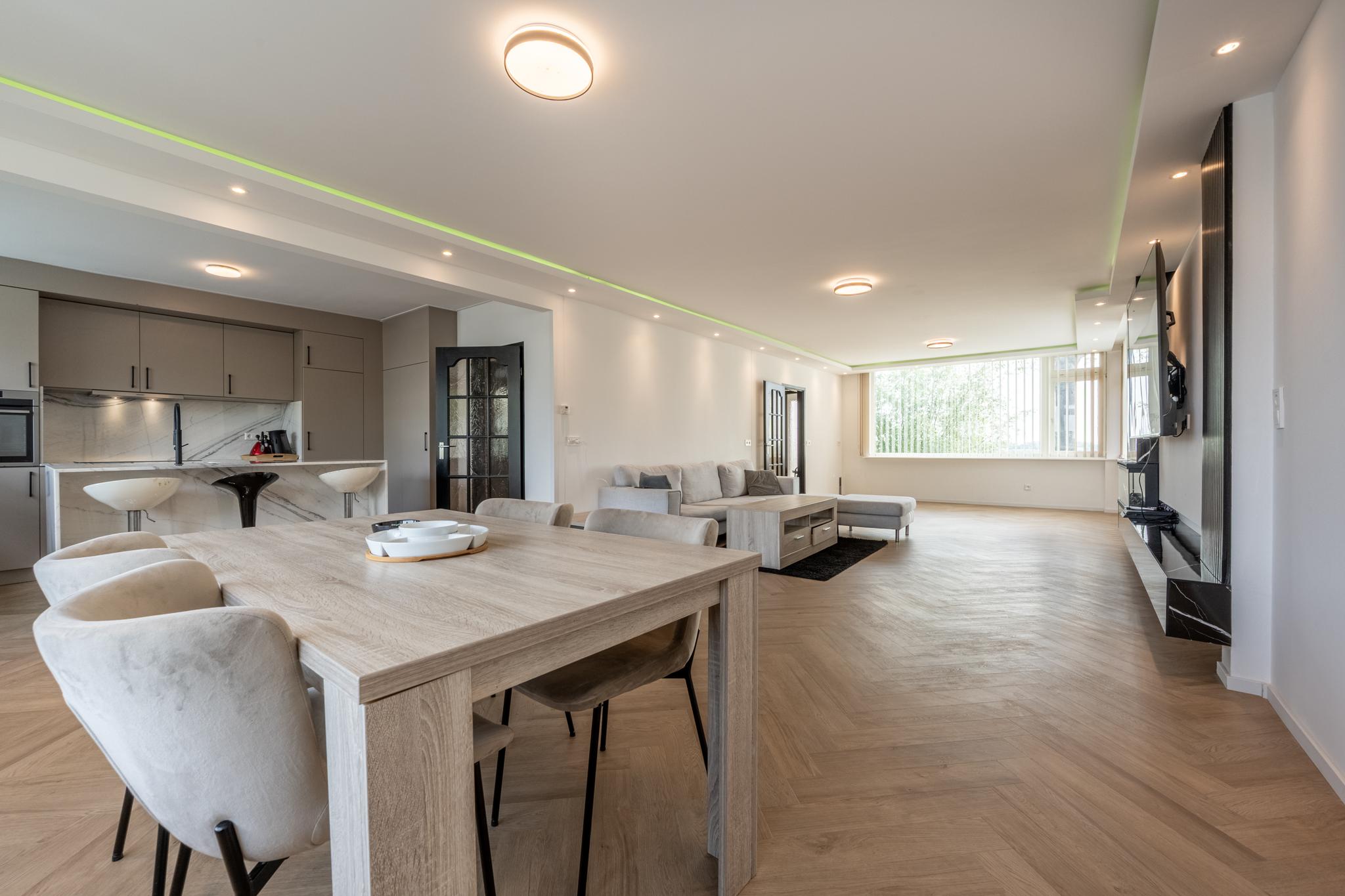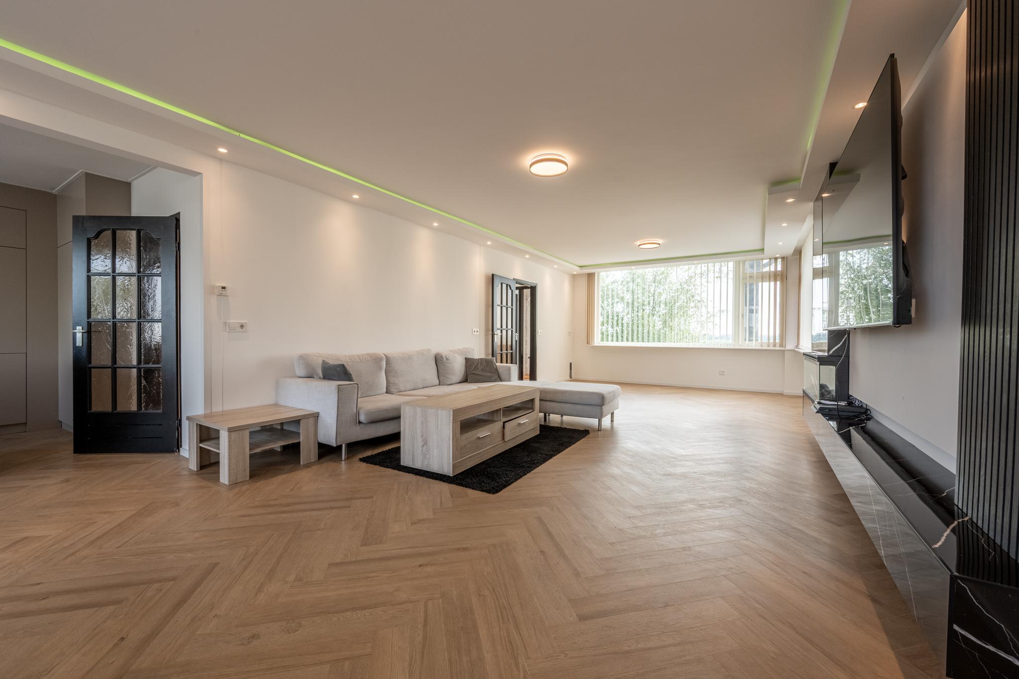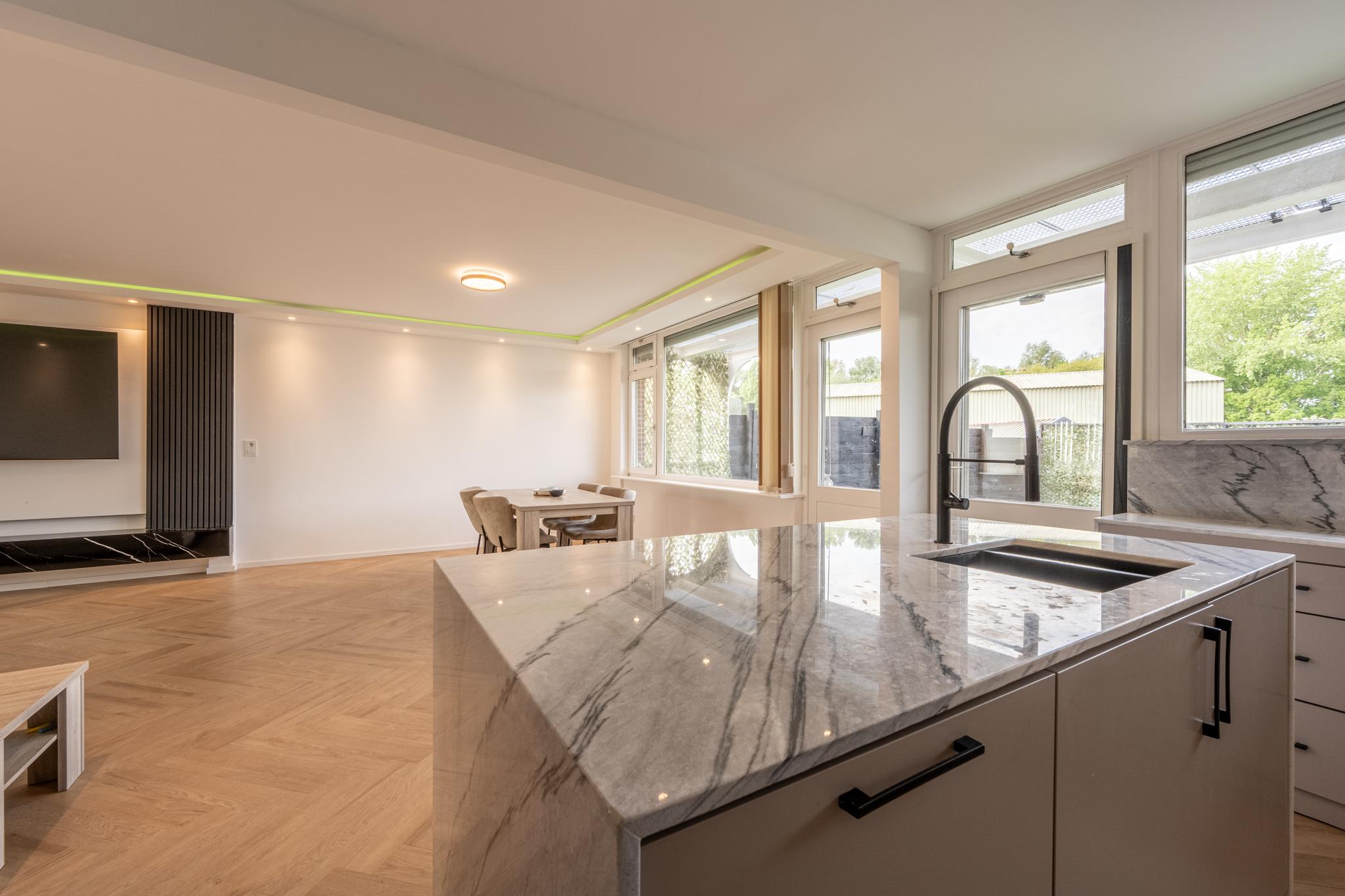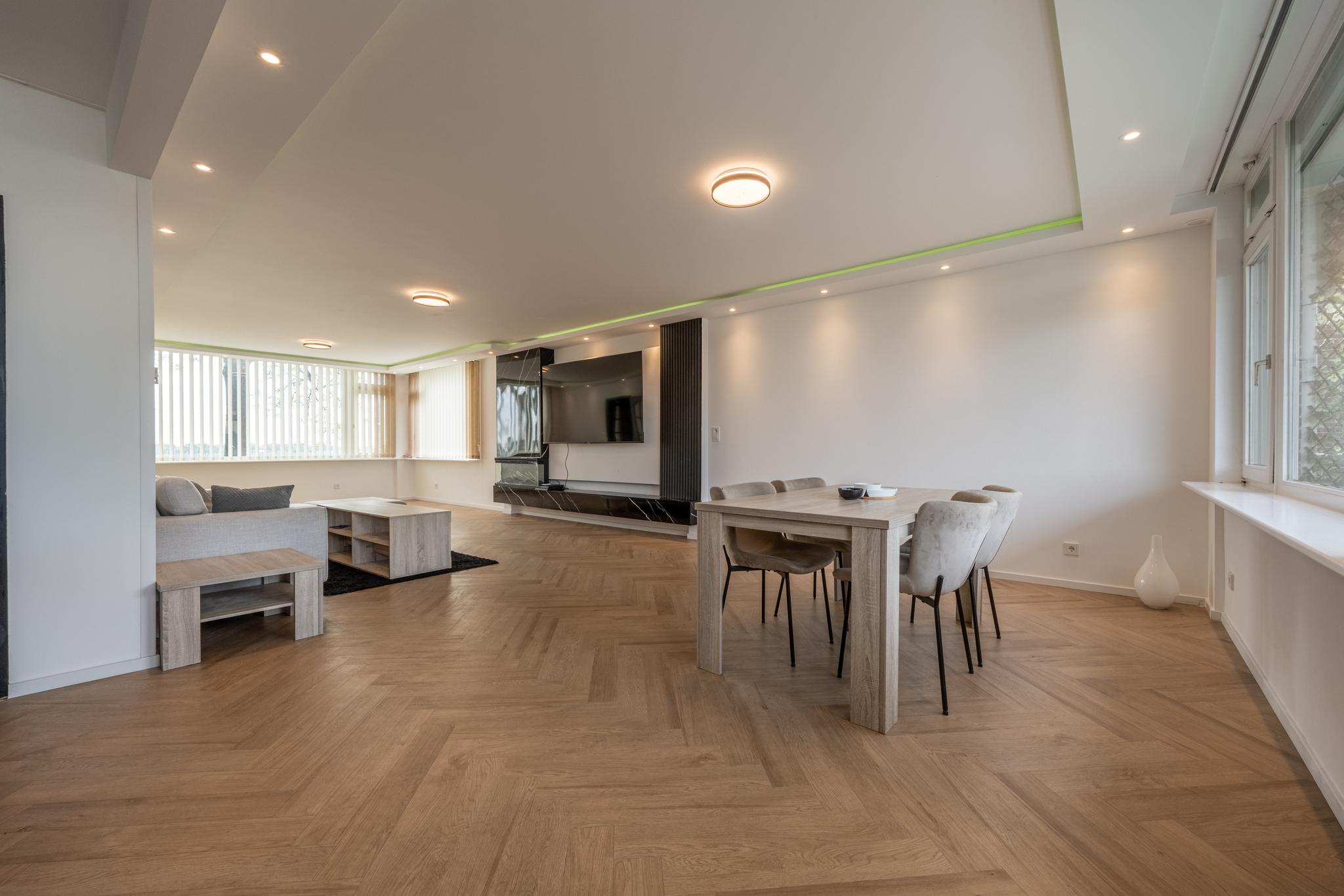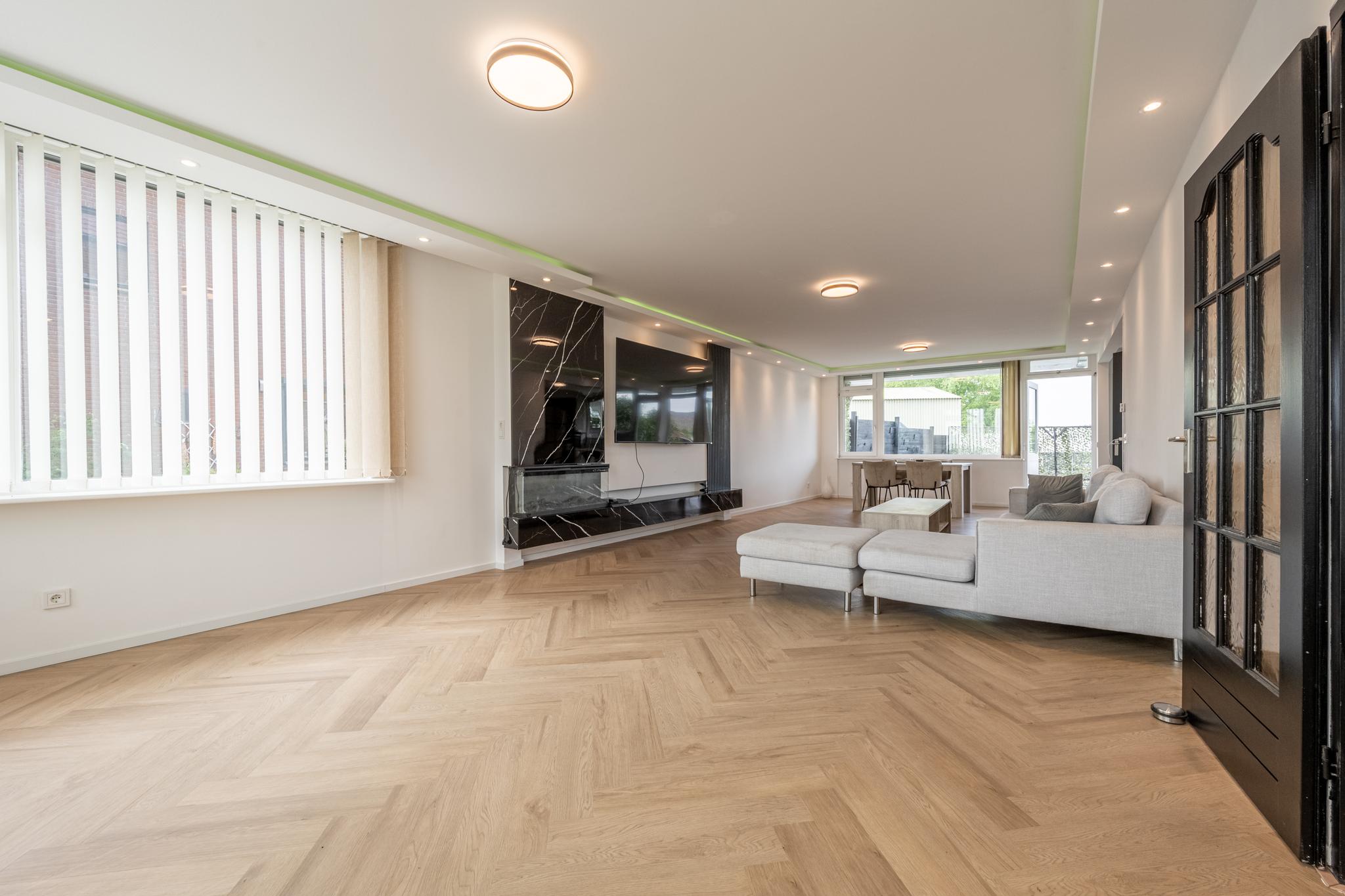 De heerlijke woonkamer is ruim van opzet en staat direct in verbinding met de eetkamer en de keuken. Het woongedeelte kent een speelse afwerking met een keurige in visgraat gelegde PVC-vloer, inbouwspots, sfeerverlichting, een elektrische sfeerhaard en verfrissende details in marmerlook.
