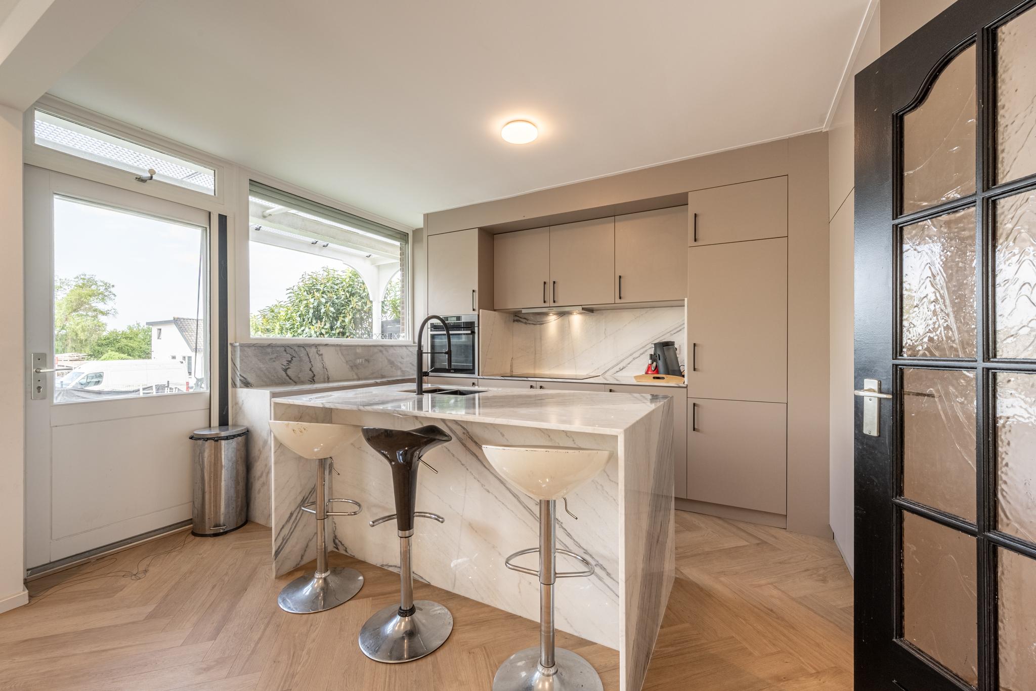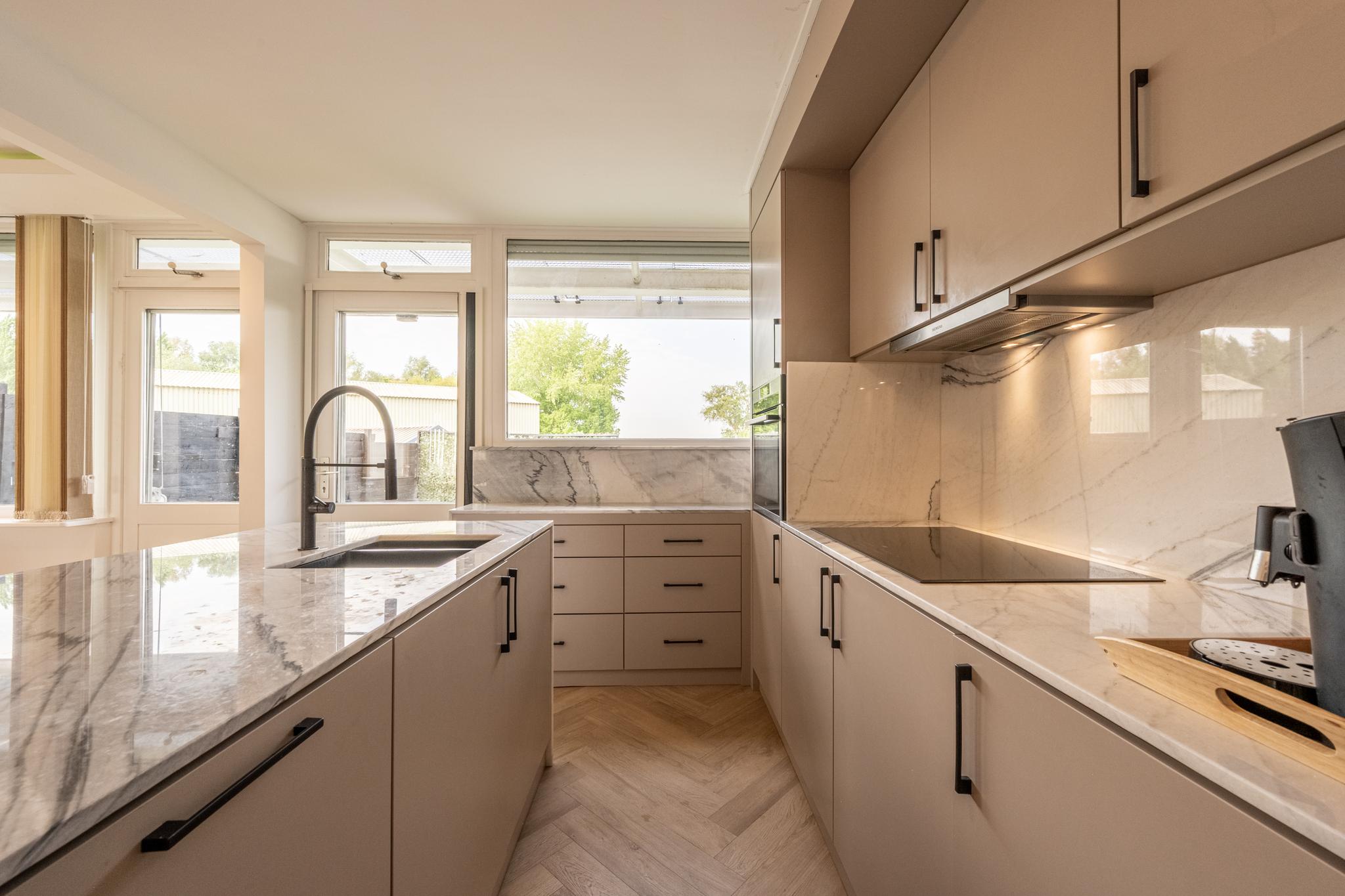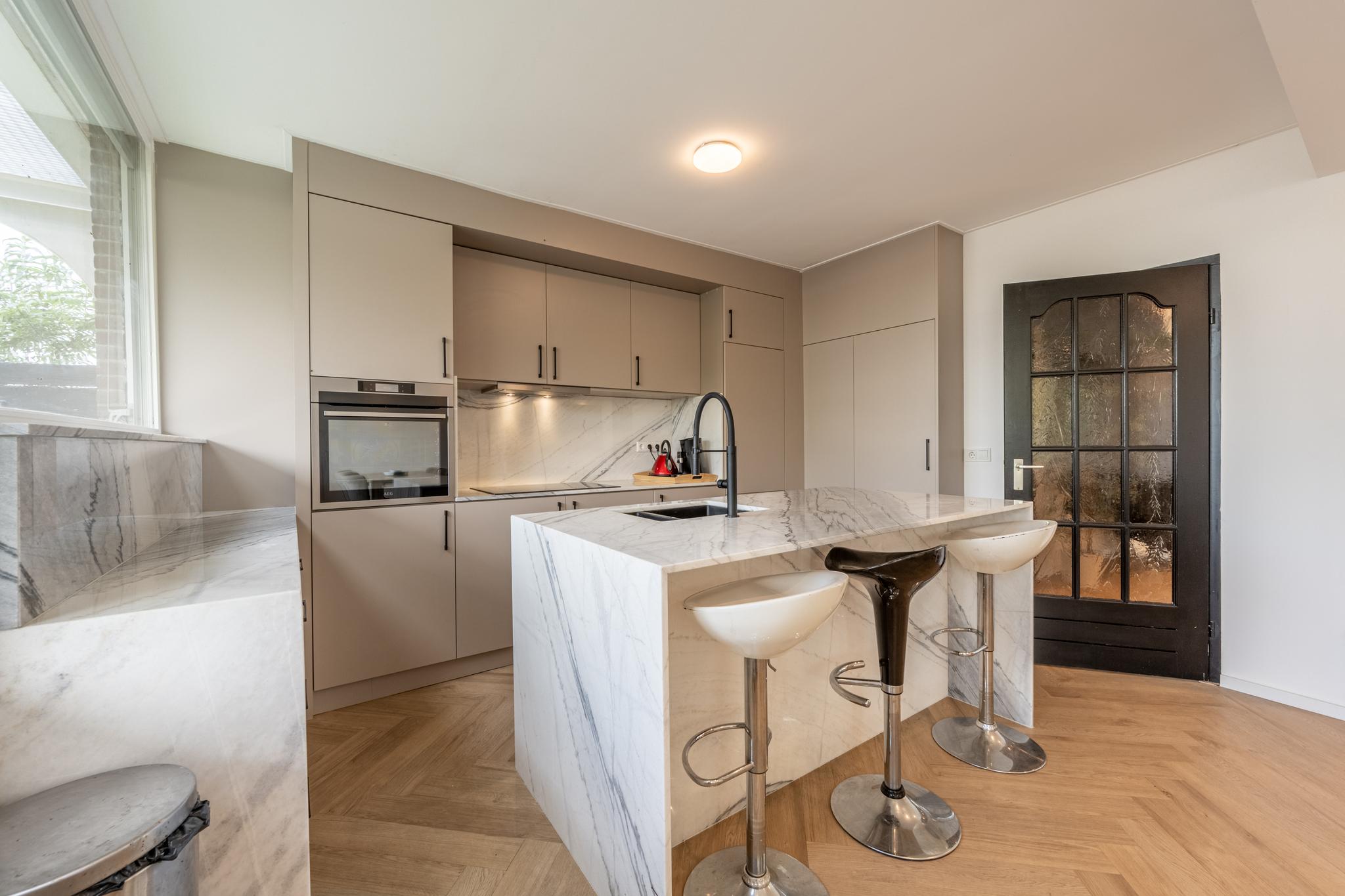 De keuken met spoeleiland vormt een opvallend middelpunt, gekenmerkt door een eigentijdse vormgeving. De moderne inbouwapparatuur bestaat onder meer uit een vaatwasser, combi-oven, een inductiekookplaat met afzuigunit en een koel-/vriescombinatie. Via een loopdeur is de achtertuin te bereiken.