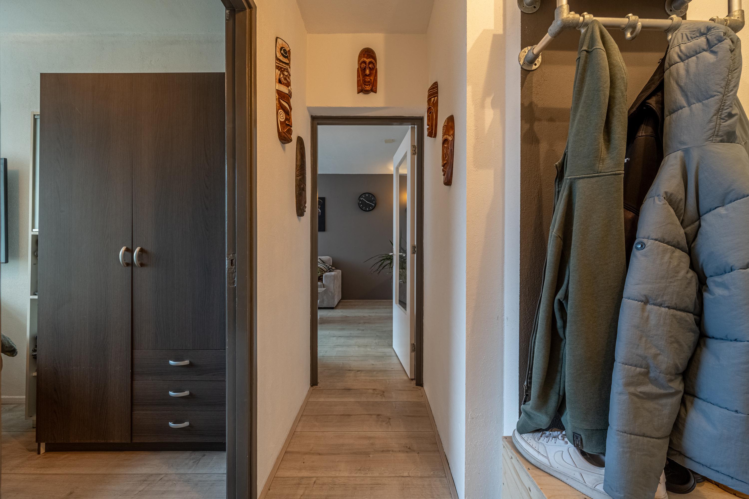 Entree in de hal, die toegang biedt tot alle vertrekken. Vanuit de hal bereikt u de woonkamer, de keuken, beide slaapkamers, de badkamer en de separate toiletruimte.