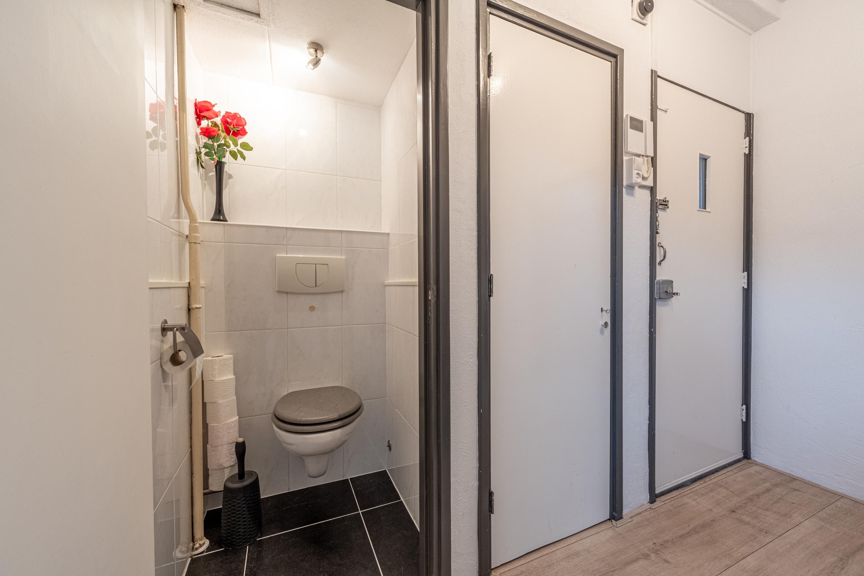 Vanaf straatniveau betreedt men het gesloten portiek met brievenbussen. Vanuit hier is er toegang tot de bergingen via een trap naar beneden en bereikt men via één trap omhoog de entree van het appartement.
