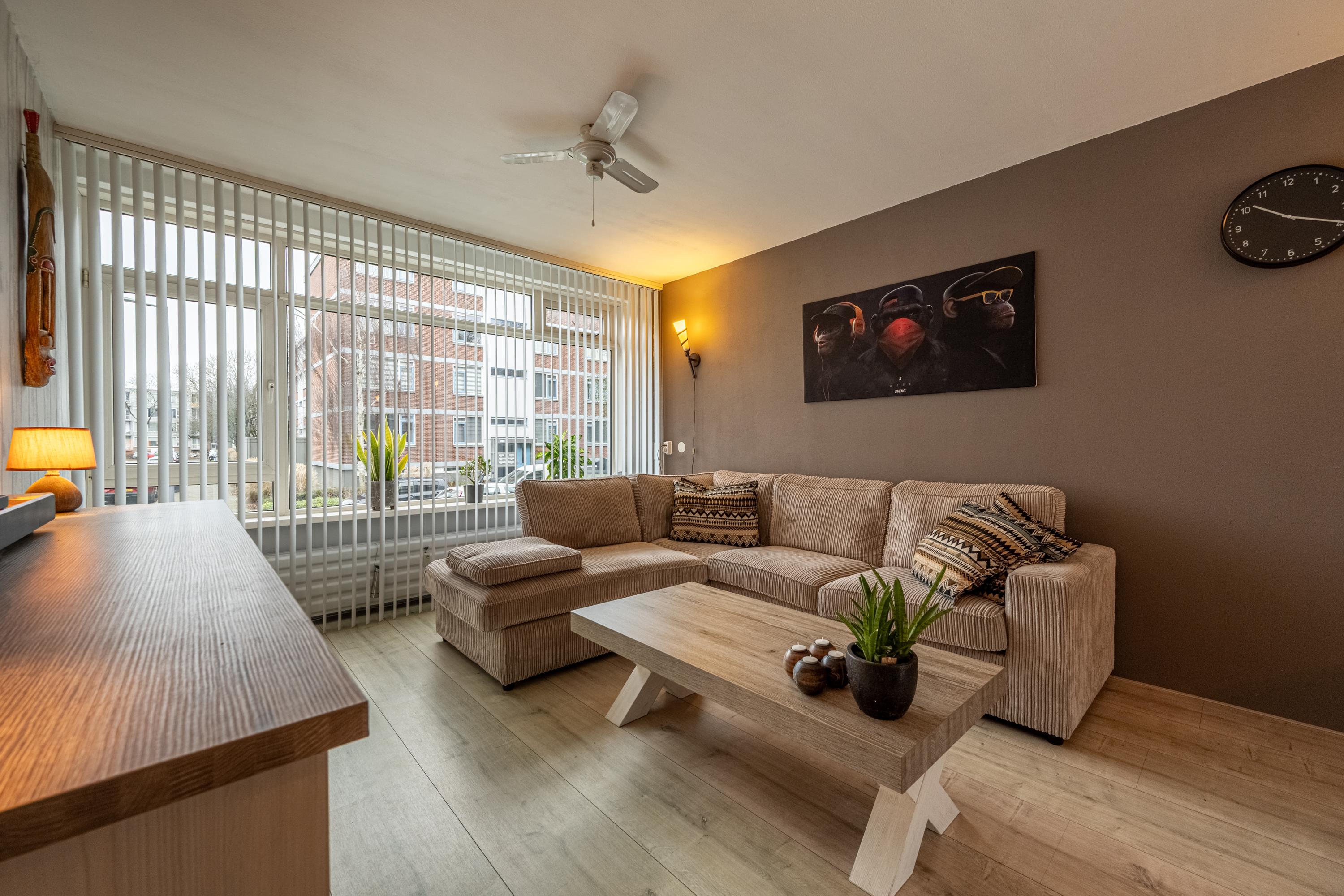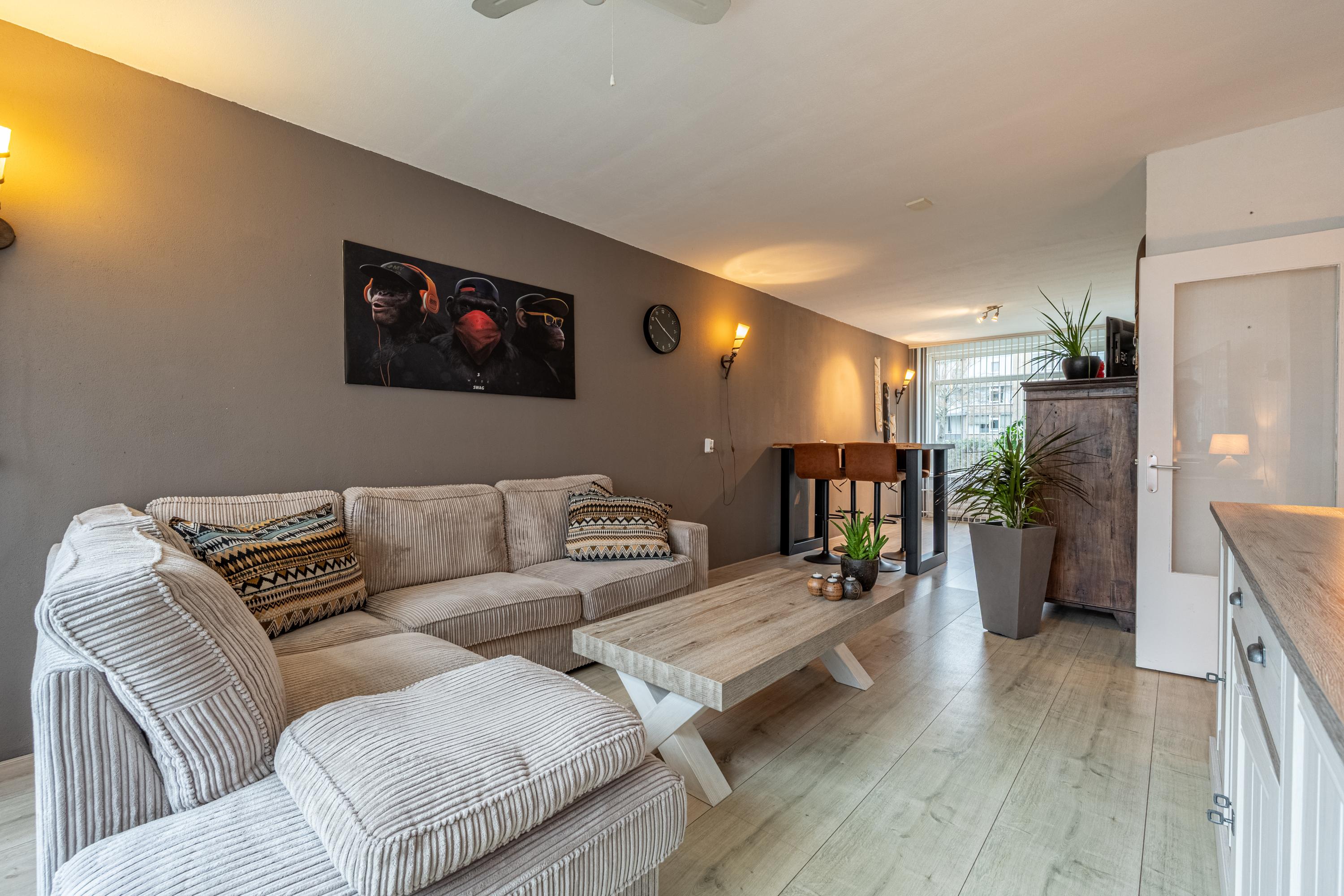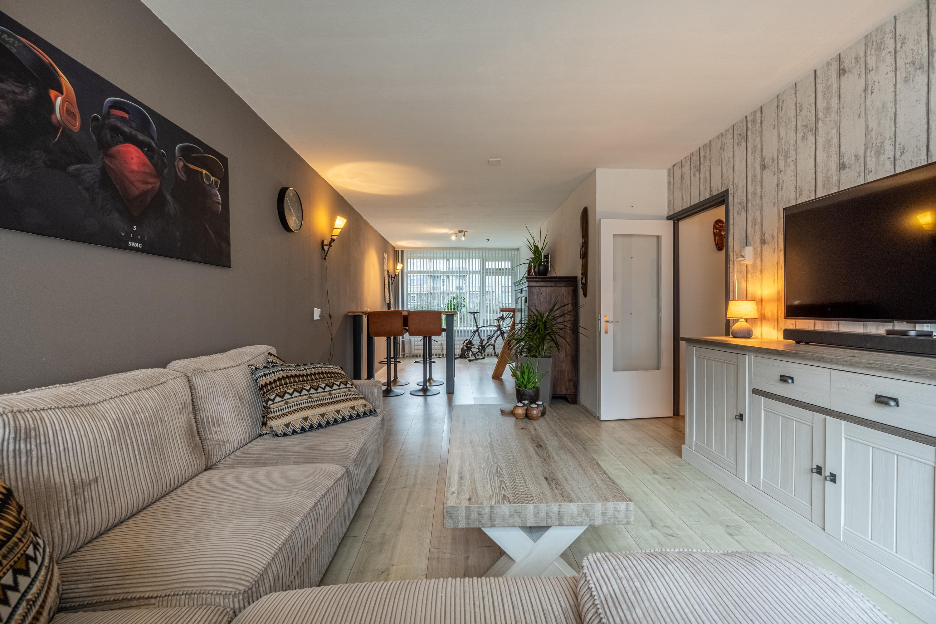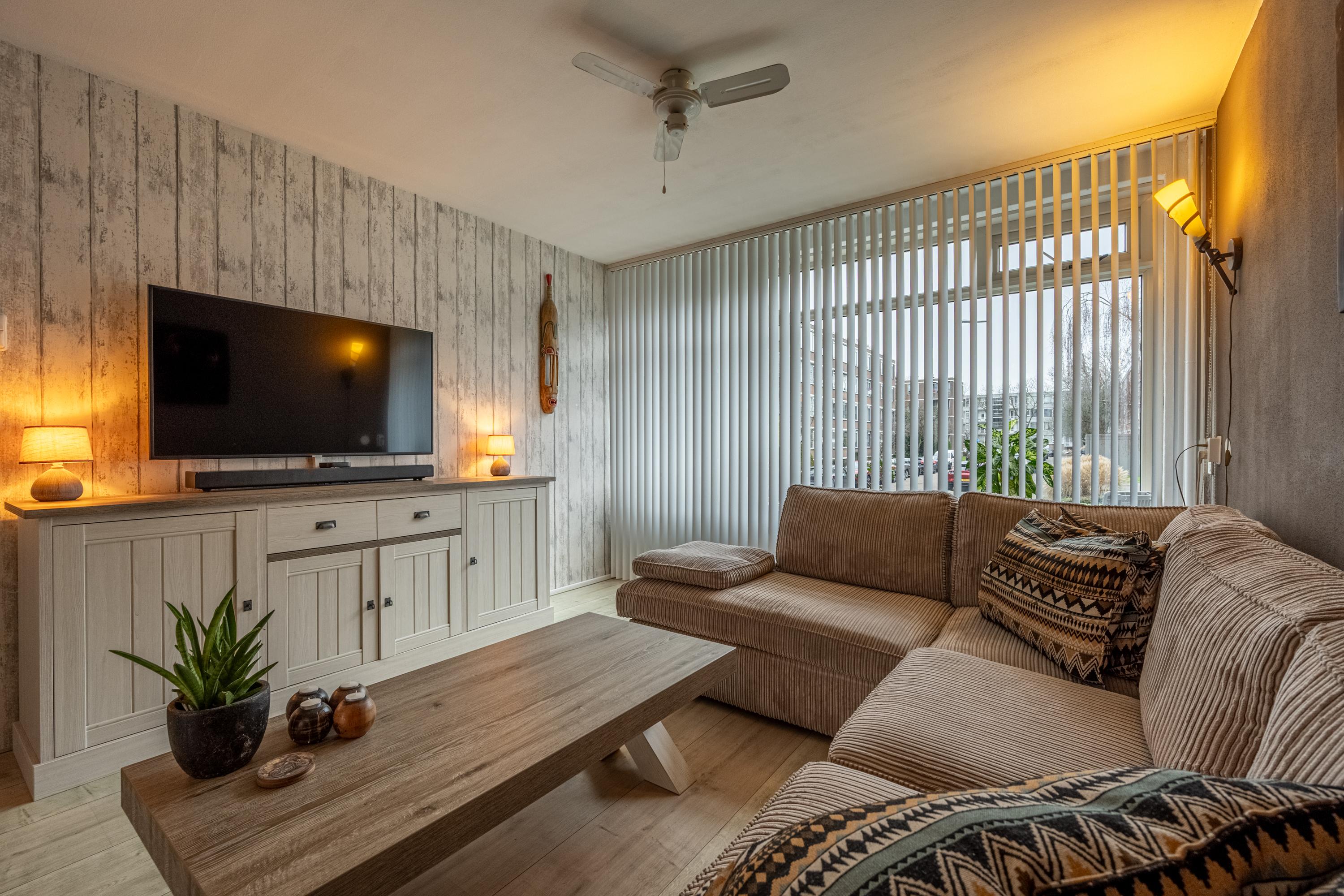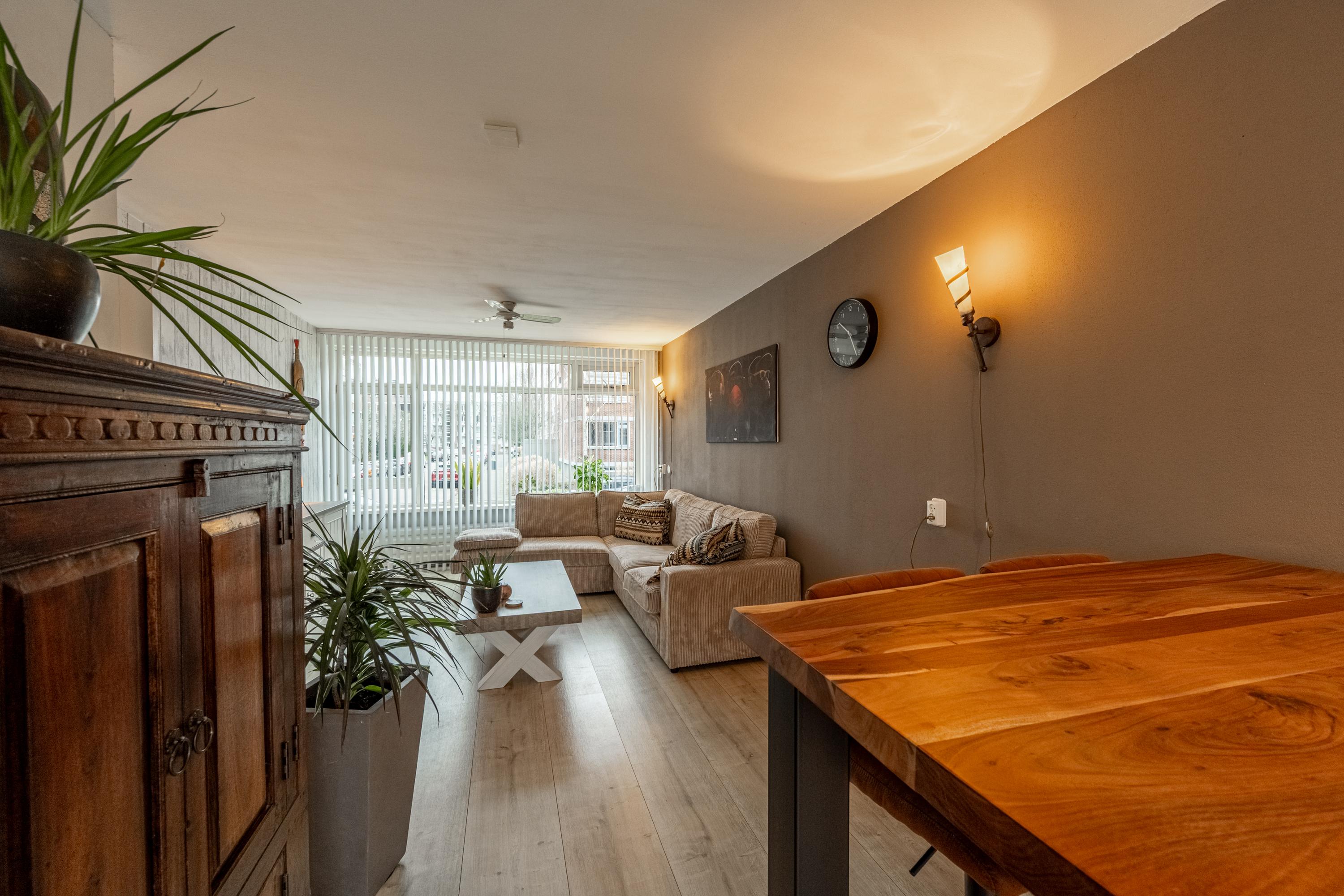 De woonkamer is licht en praktisch ingedeeld en biedt voldoende ruimte voor een zit- en eetgedeelte.