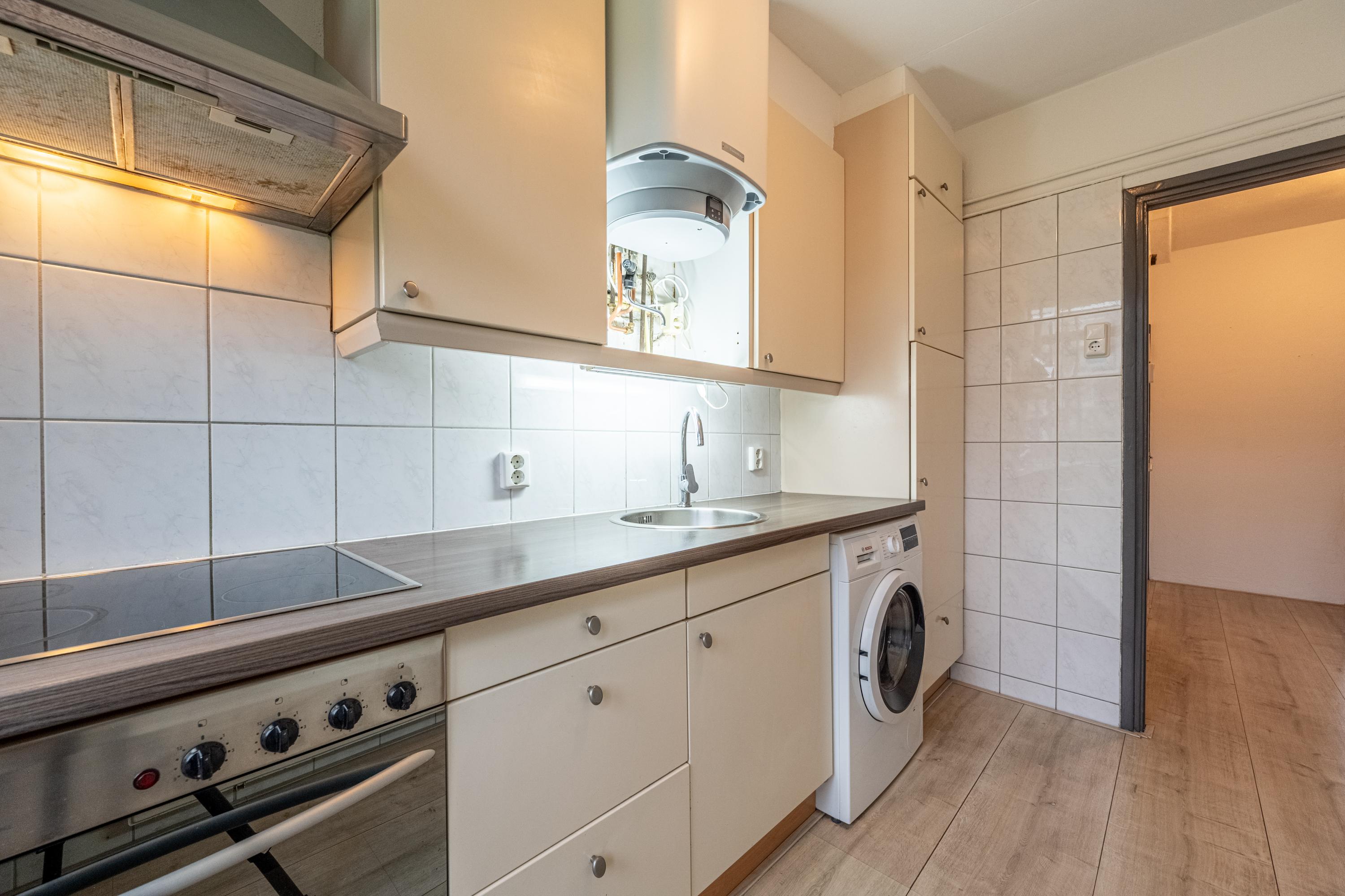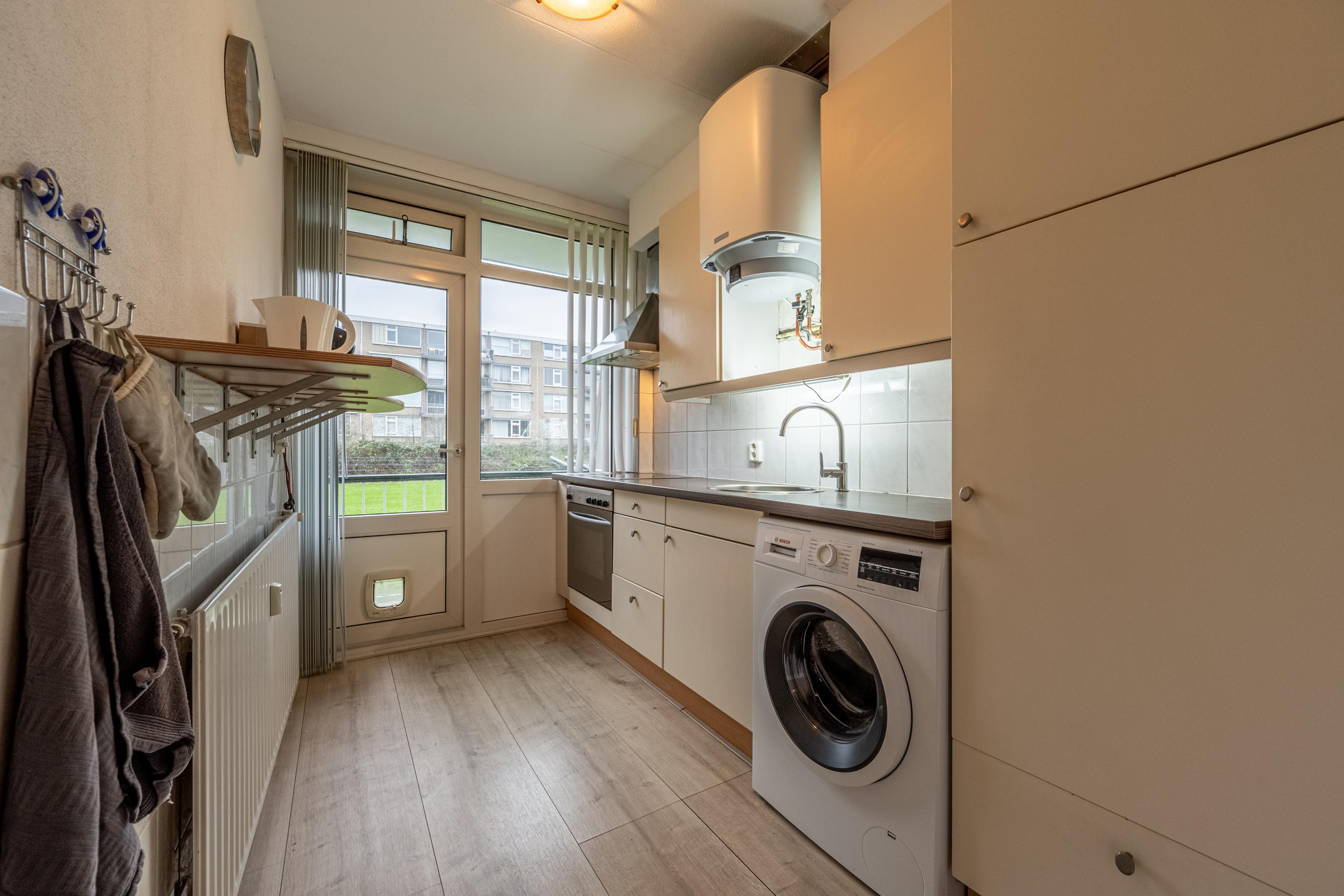De keuken is uitgevoerd in een enkele wandopstelling en voorzien van een inductiekookplaat, afzuigkap, oven, koelkast en een aansluiting voor de wasmachine. Vanuit de keuken is er toegang tot het balkon, gelegen op het noorden.