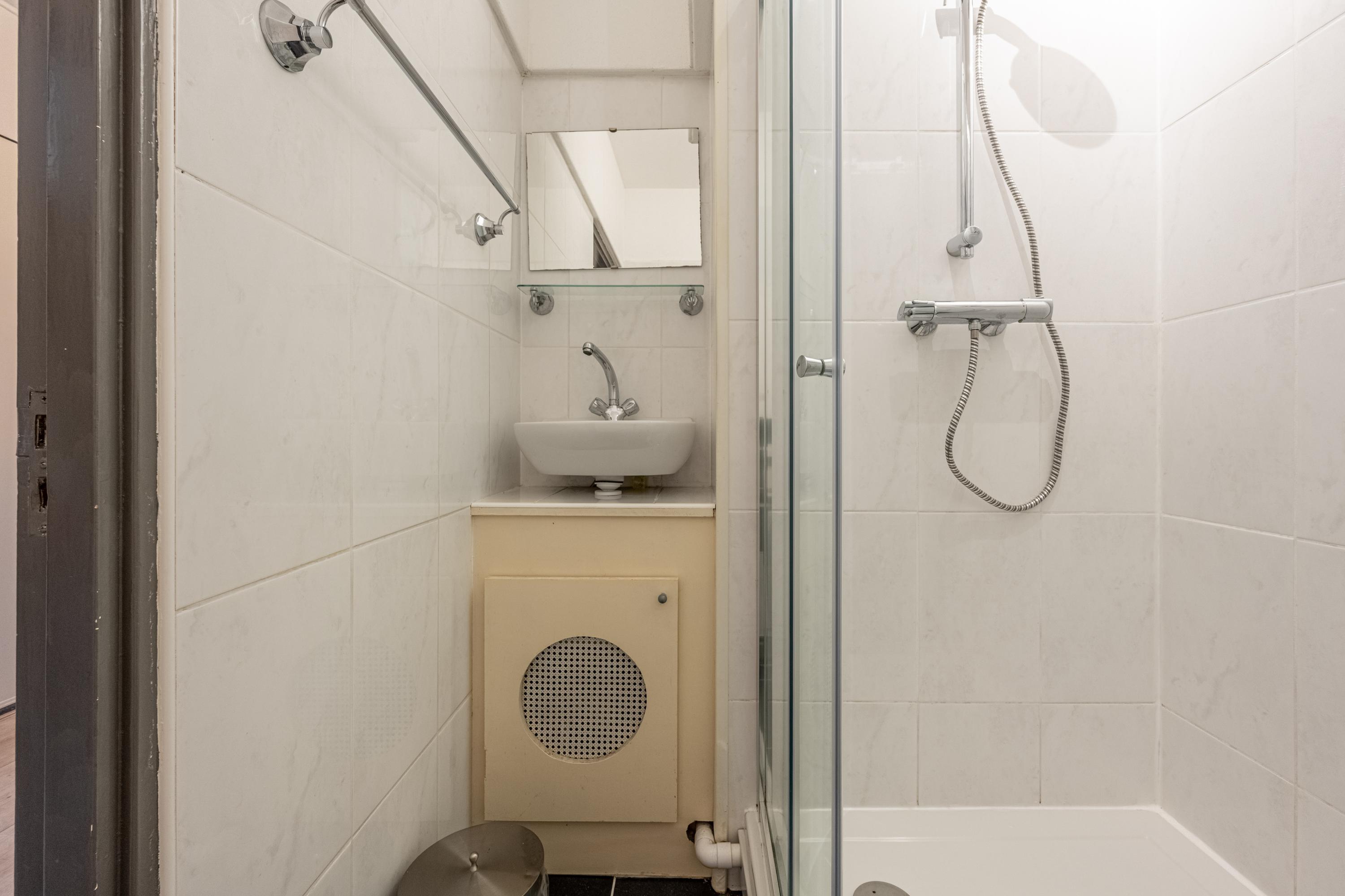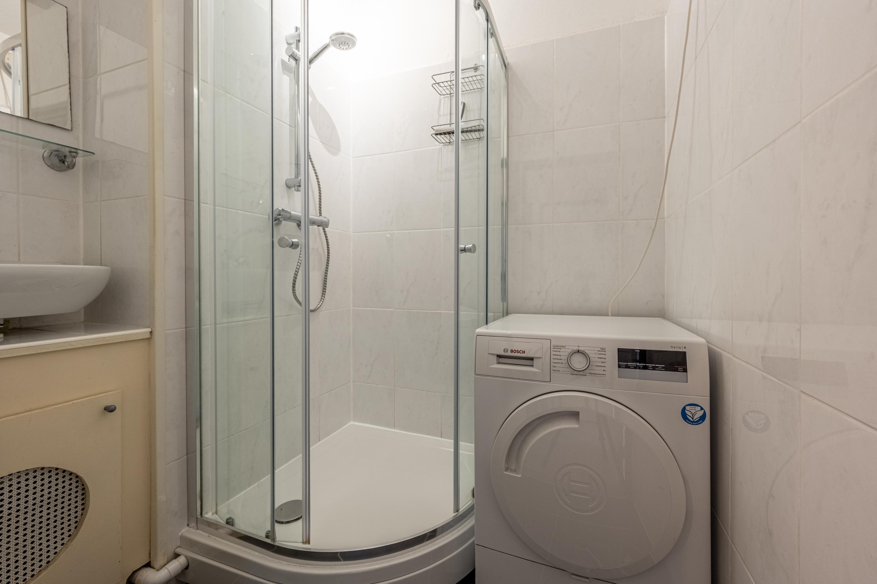 De badkamer is bereikbaar vanuit de hal en ingericht met een douchecabine en wastafel. De opstelling voor de droger bevindt zich momenteel eveneens in de badkamer. Daarnaast is er een separate toiletruimte.