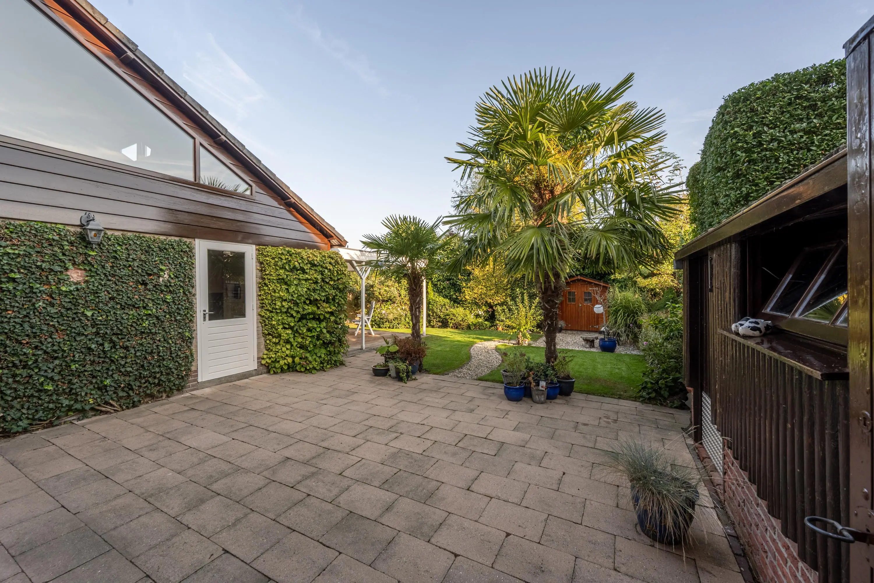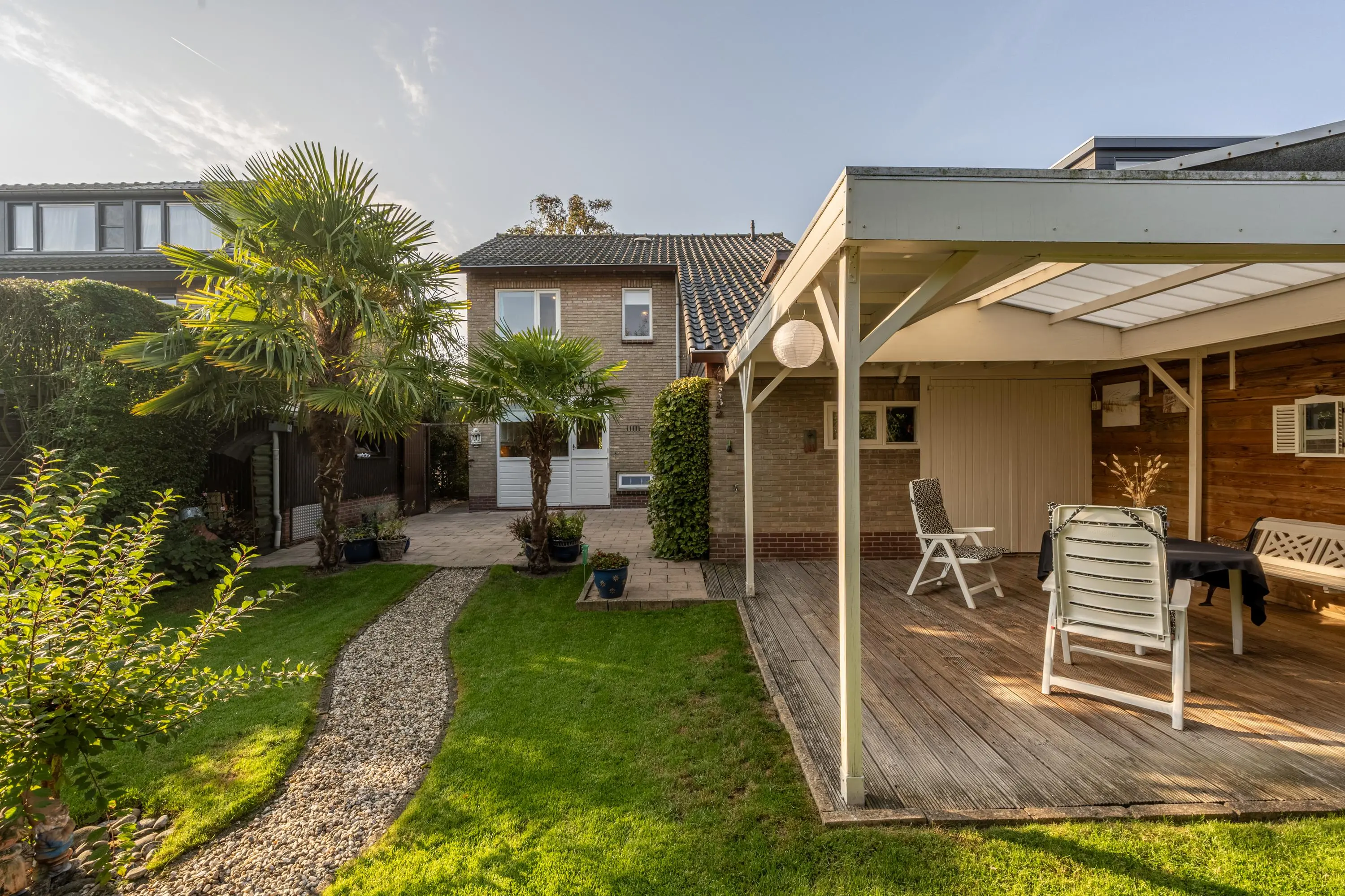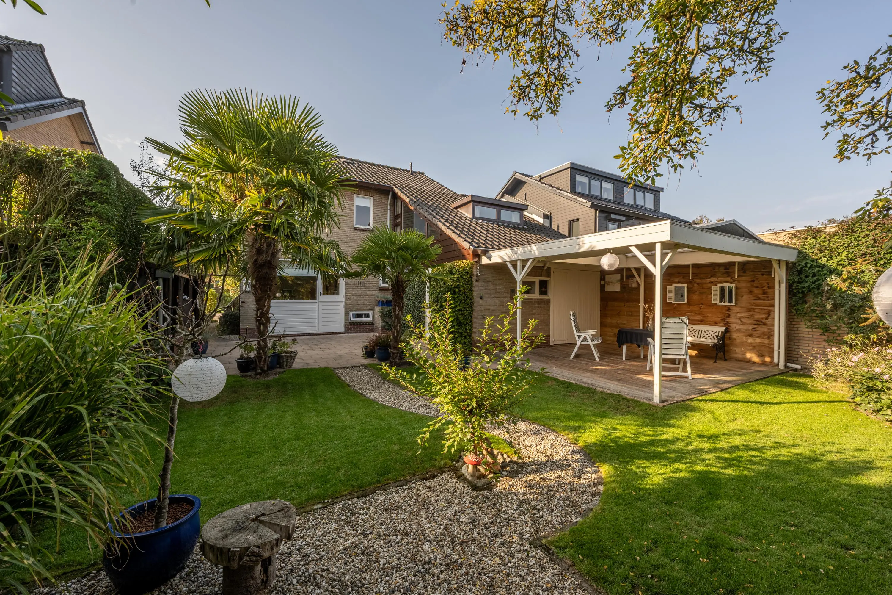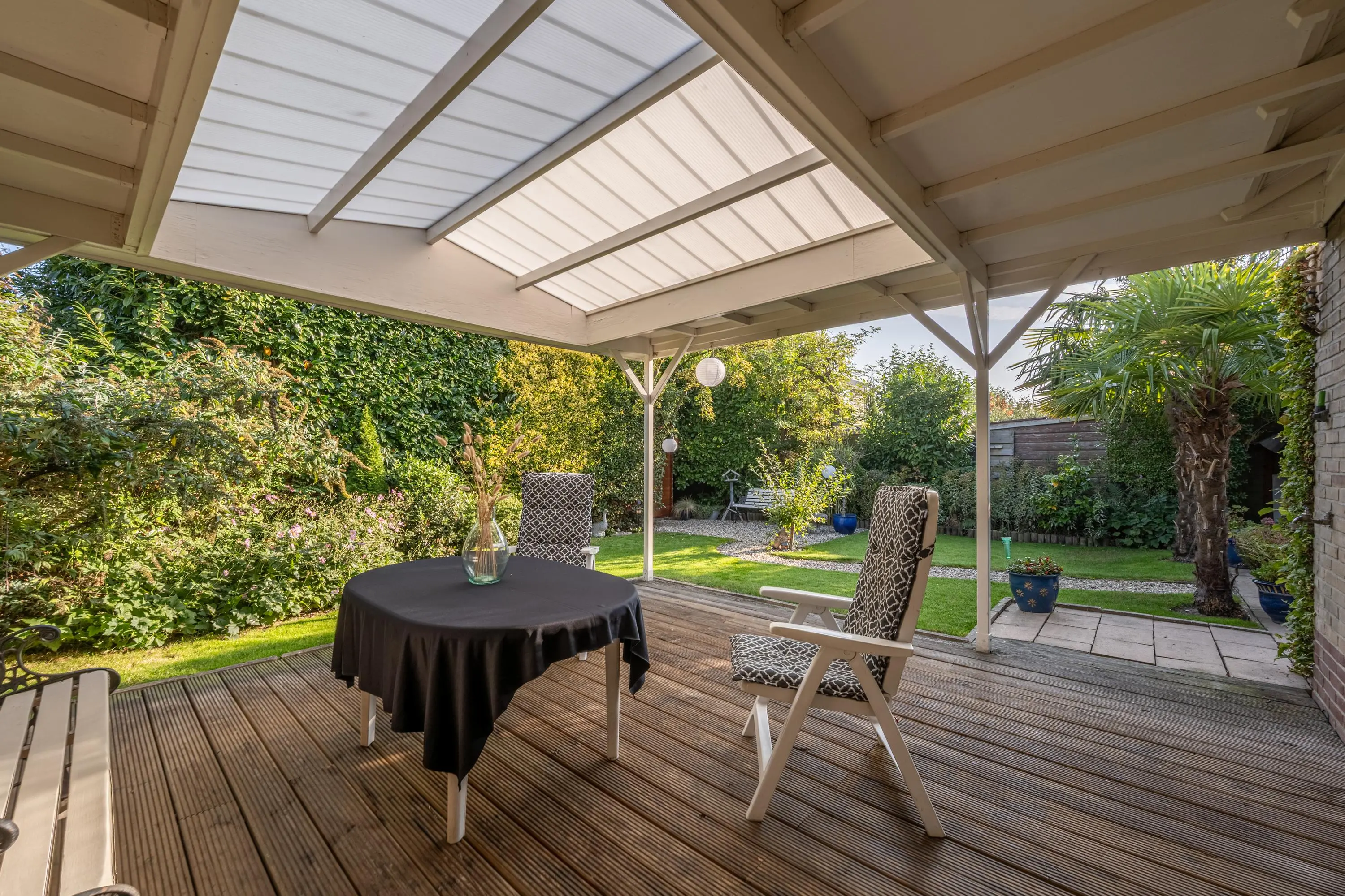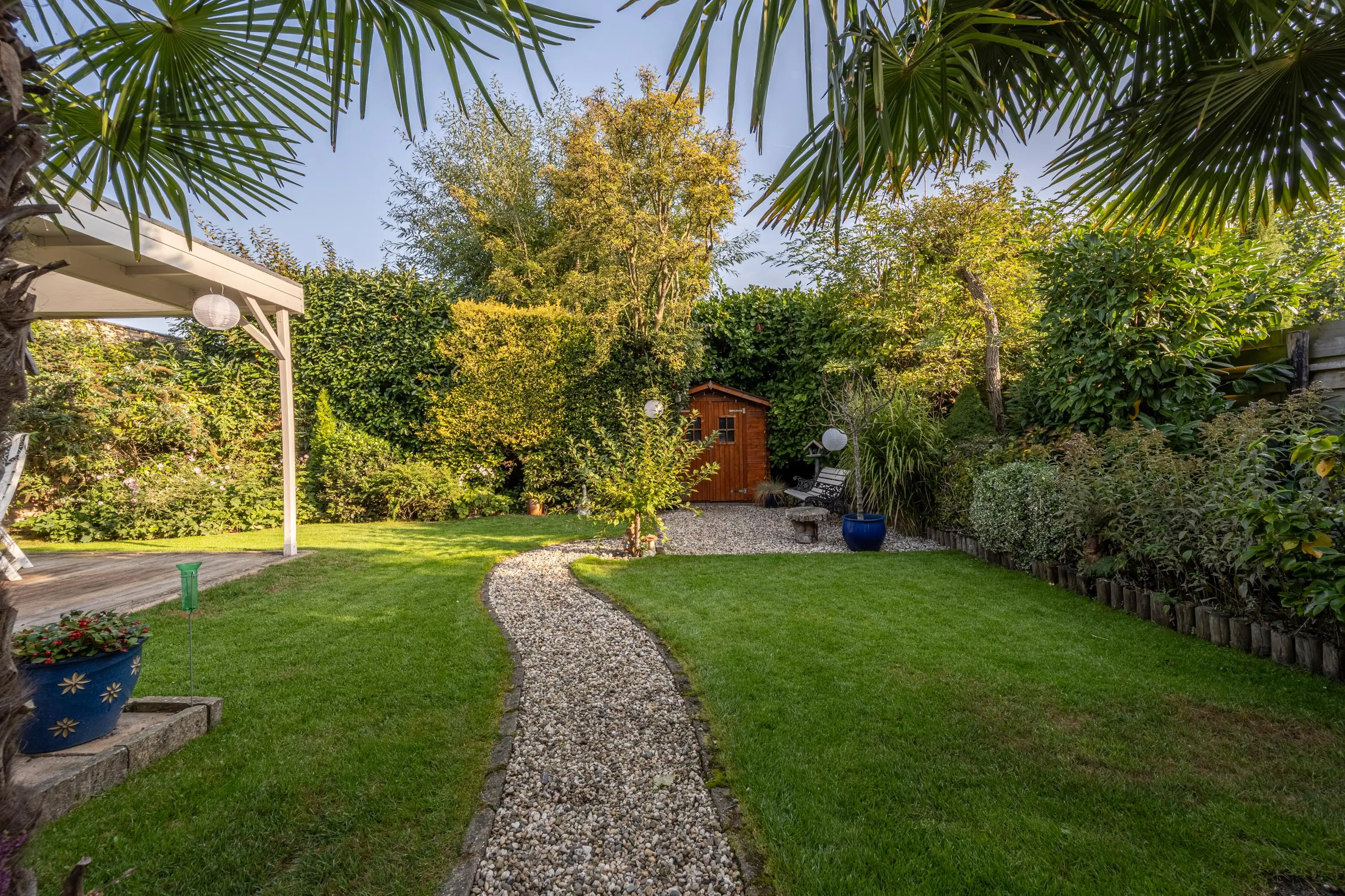 Rondom de woning ligt de prachtig aangelegde, zonnige tuin. Deze groene oase biedt een perfecte balans tussen zon en schaduw, met een fraai gazon, meerdere gezellige terrassen en vaste borders vol beplanting.