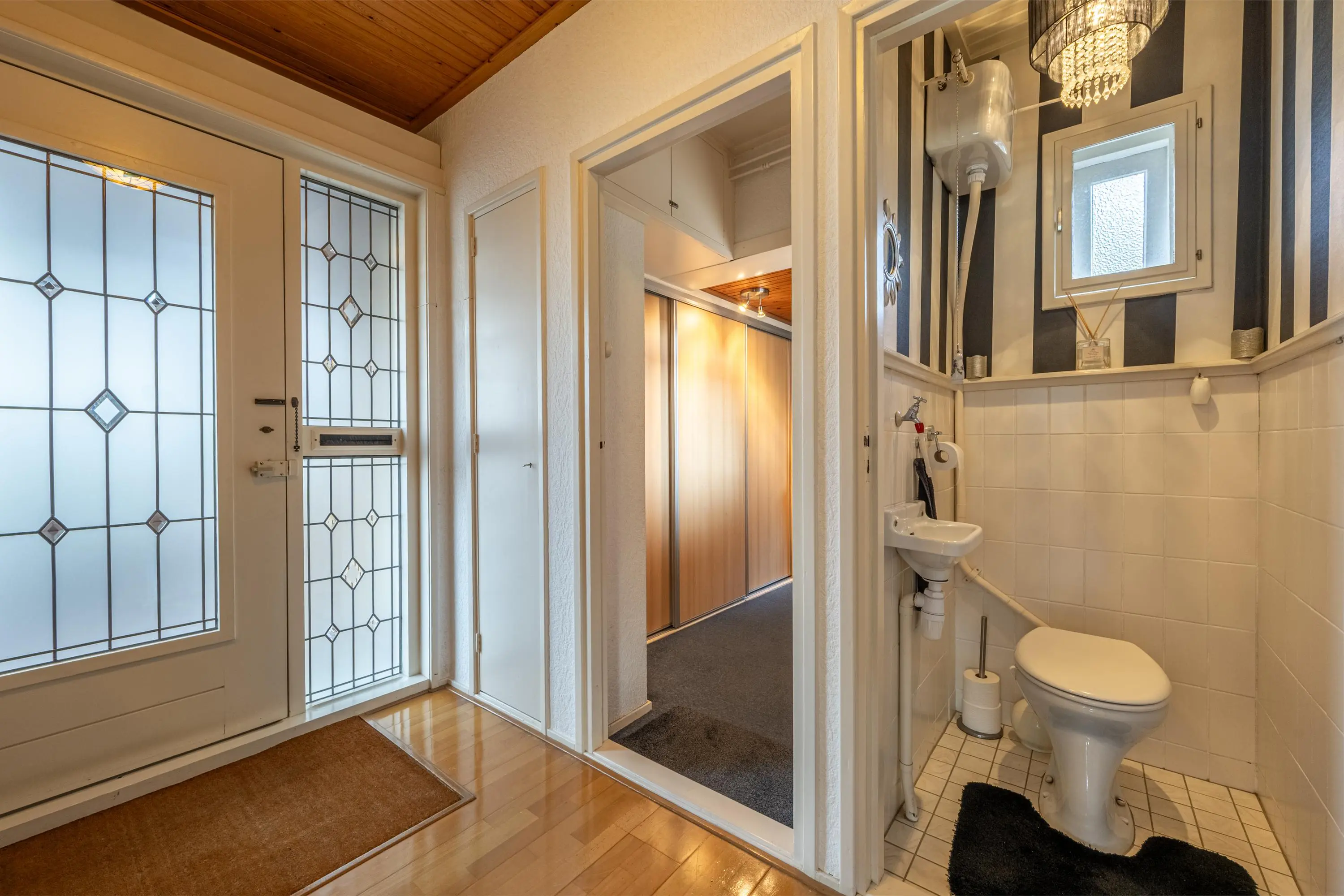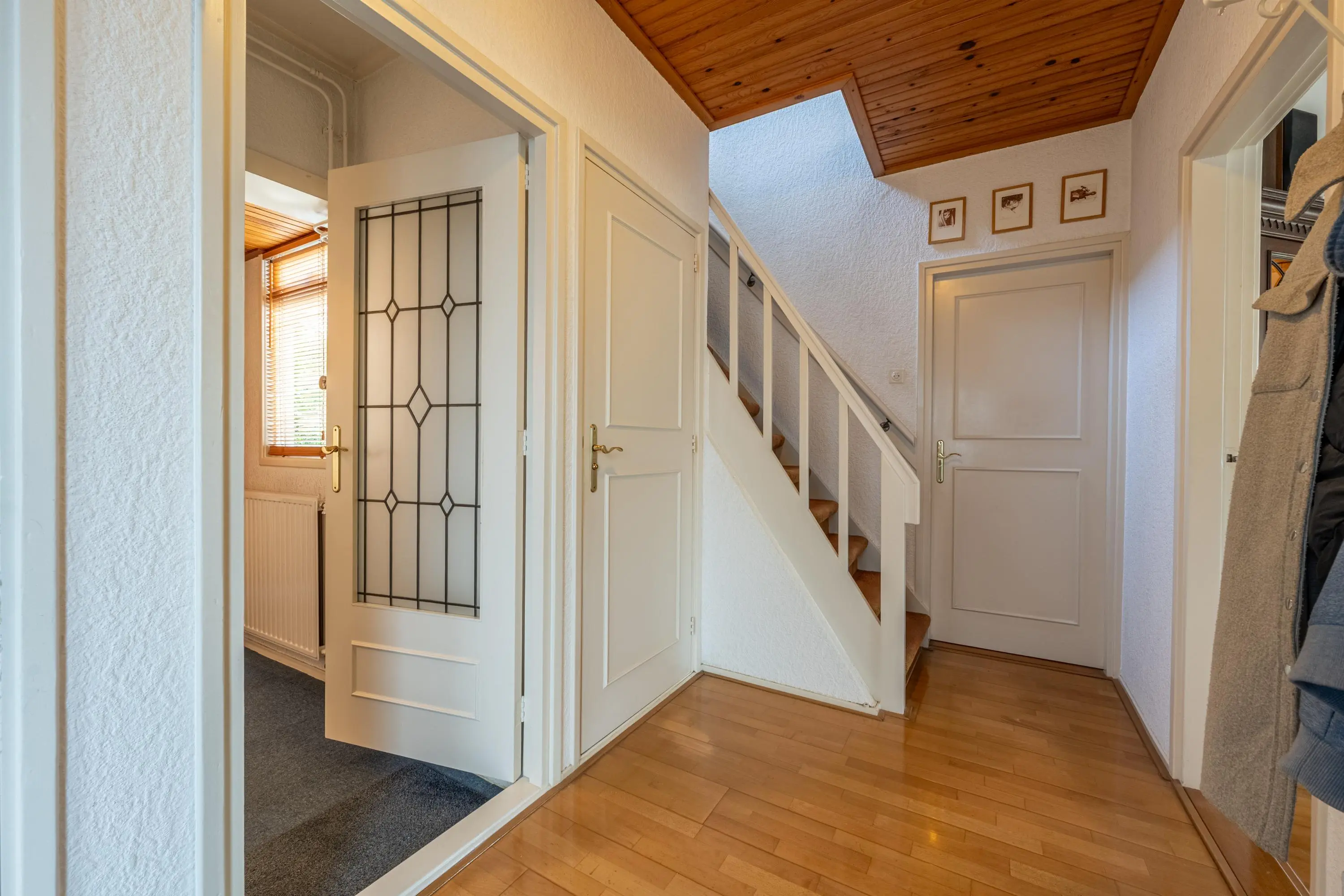 Direct bij binnenkomst valt de royale ontvangsthal met de prettige ruimtebeleving op. De lichte hal biedt toegang tot een keurige toiletruimte en de trapopgang naar de verdieping.