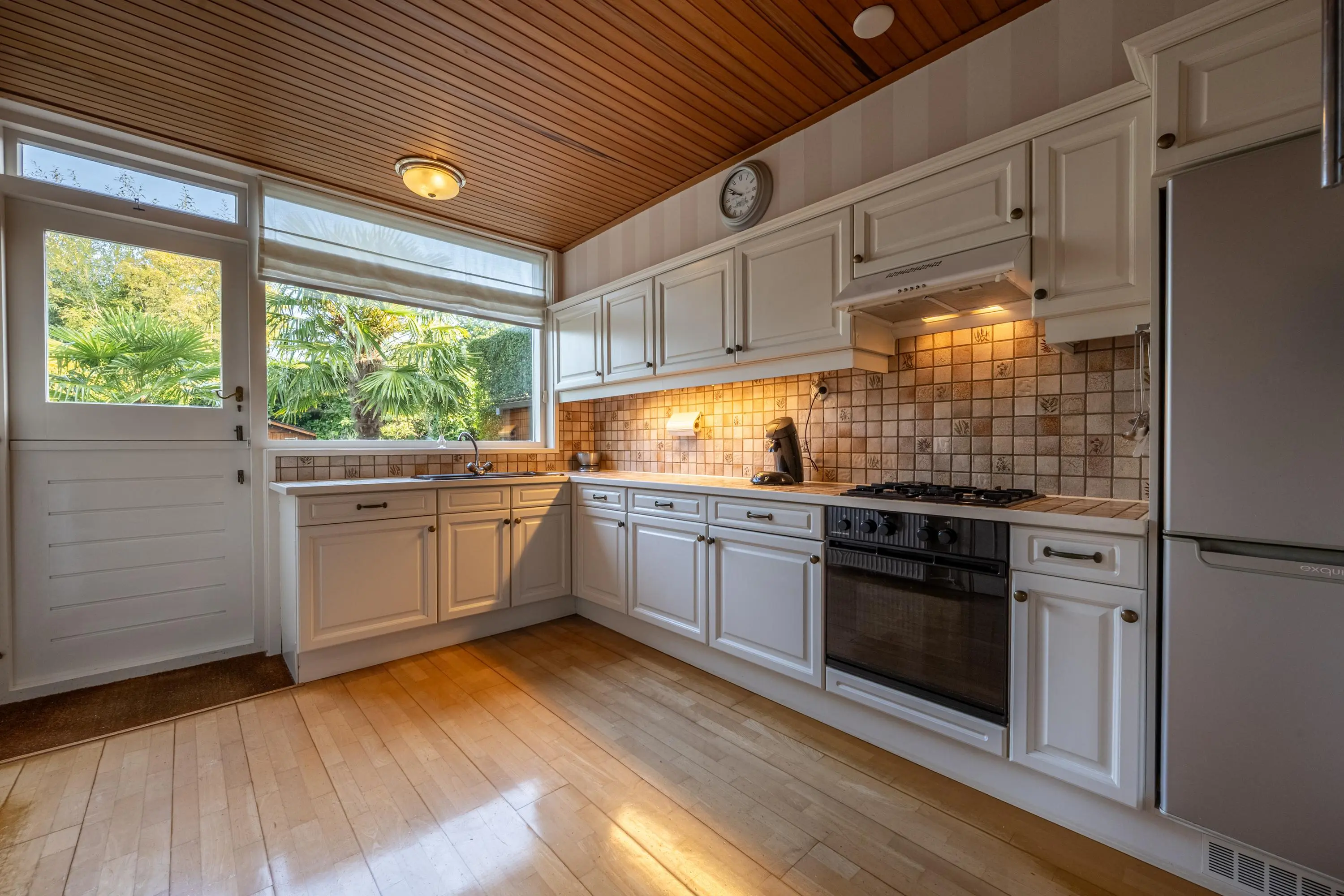 De gesloten keuken grenst aan de woonkamer en is ingericht met een hoekopstelling voorzien van diverse inbouwapparatuur, te weten een gaskookplaat, afzuigschouw, oven en koel-/vriescombinatie. Vanuit de keuken is er een prettig uitzicht op de heerlijke achtertuin, een fijne toevoeging tijdens het koken of het bereiden van een ontbijt. De achtertuin is via een loopdeur te bereiken.