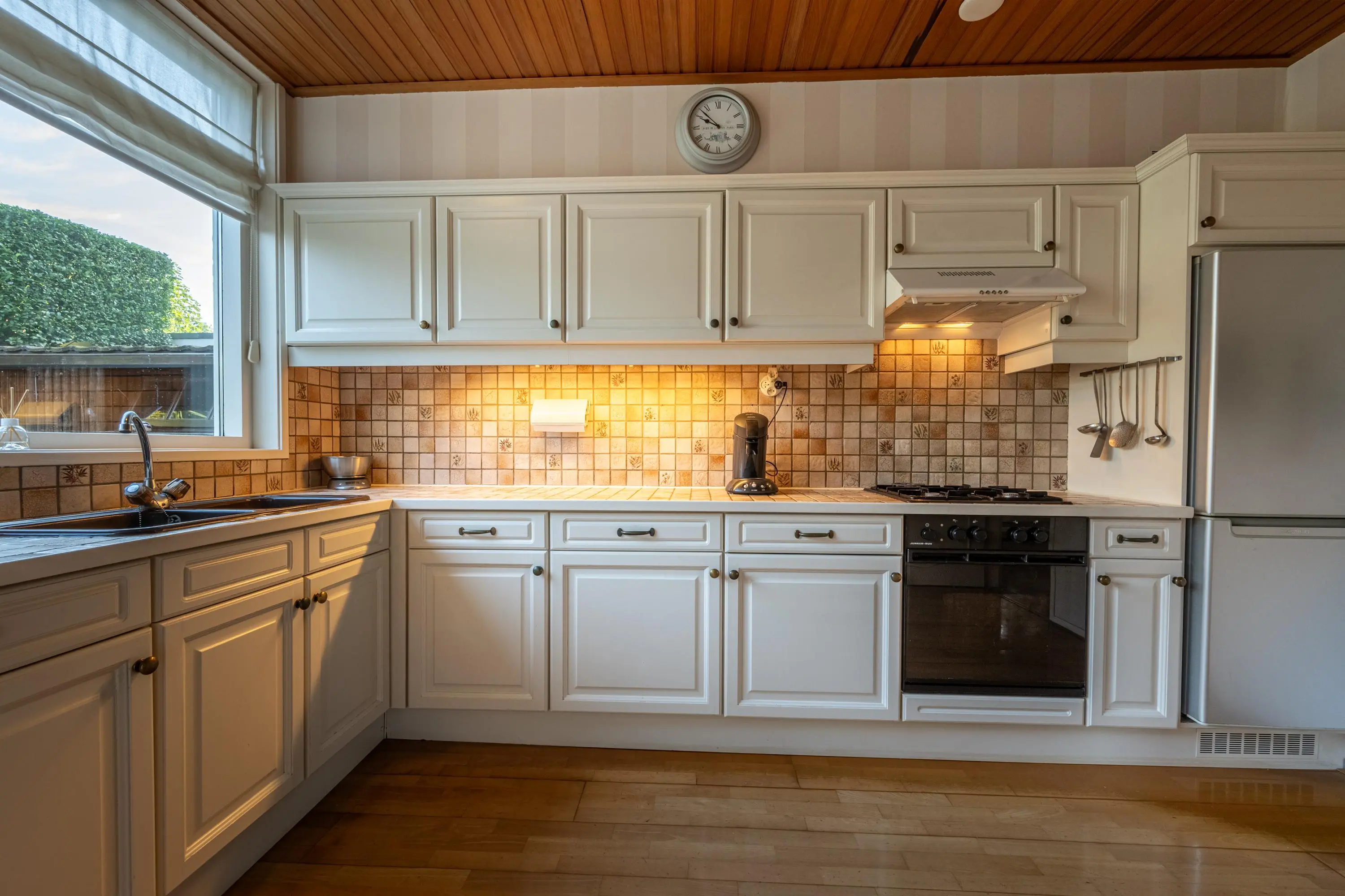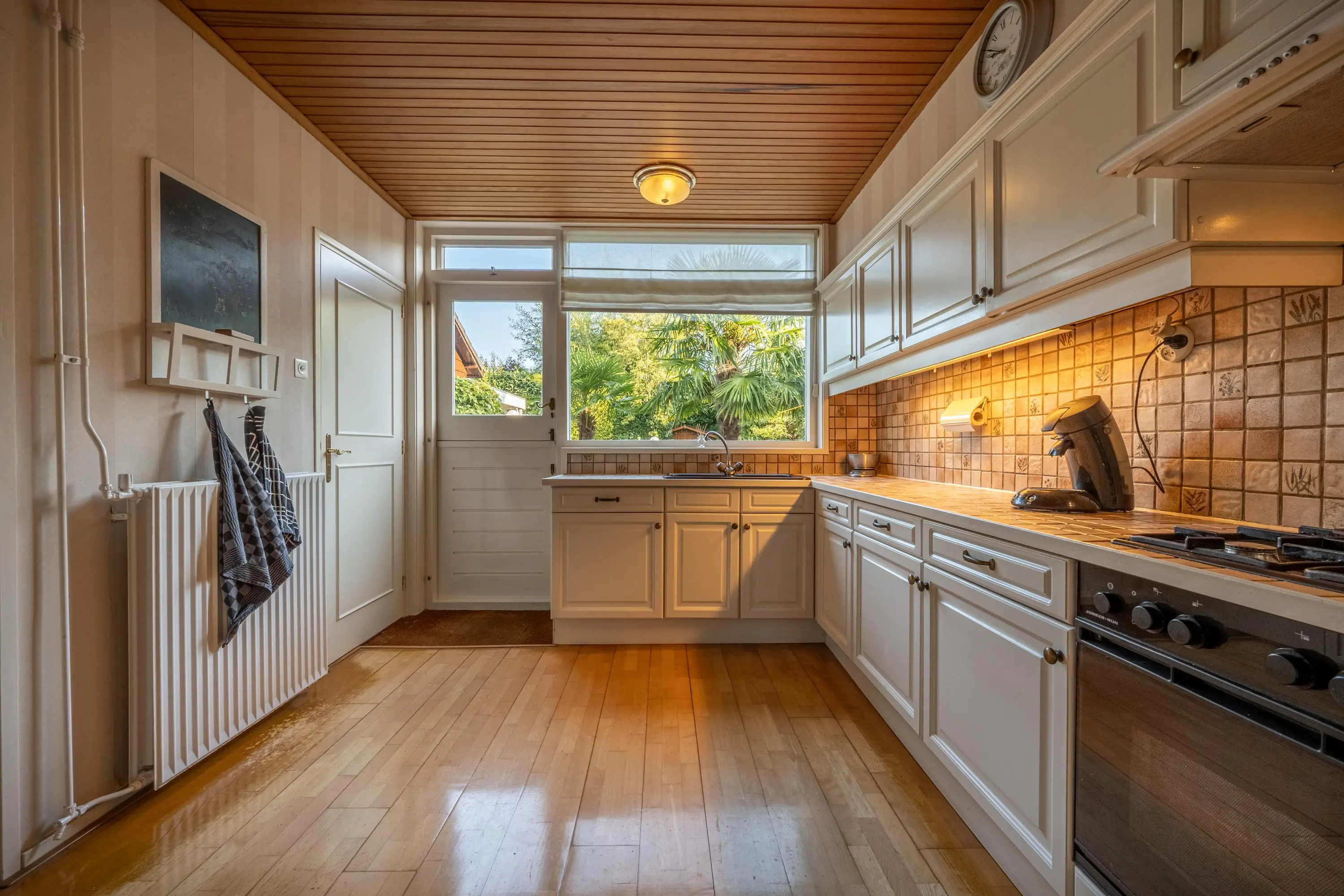 Aansluitend bevindt zich de bijkeuken, uitgerust met aansluitingen voor de wasmachine en droger. Via de bijkeuken is er een doorgang naar de garage.
