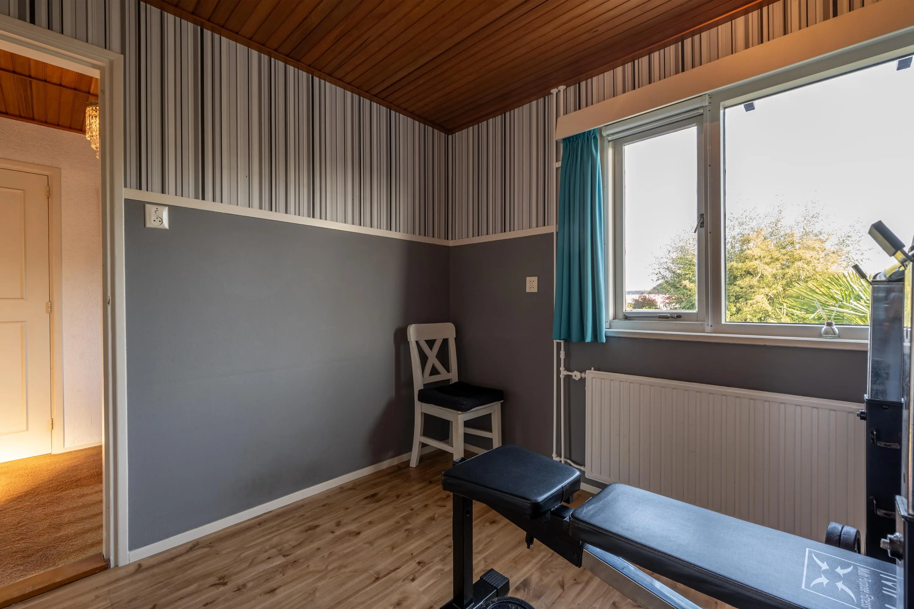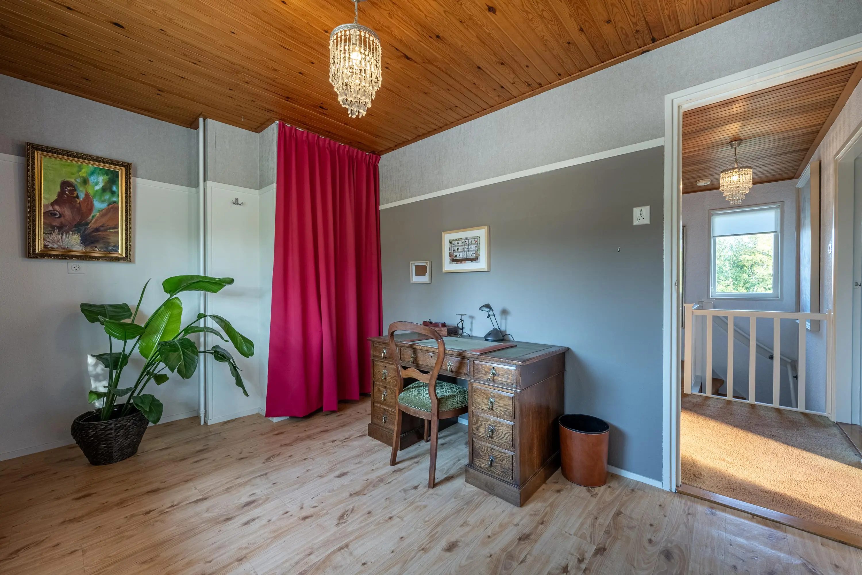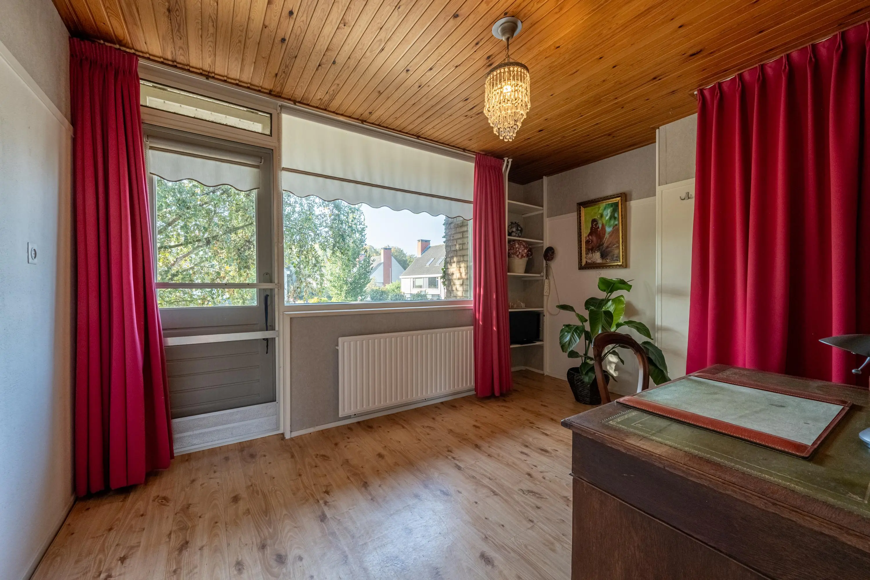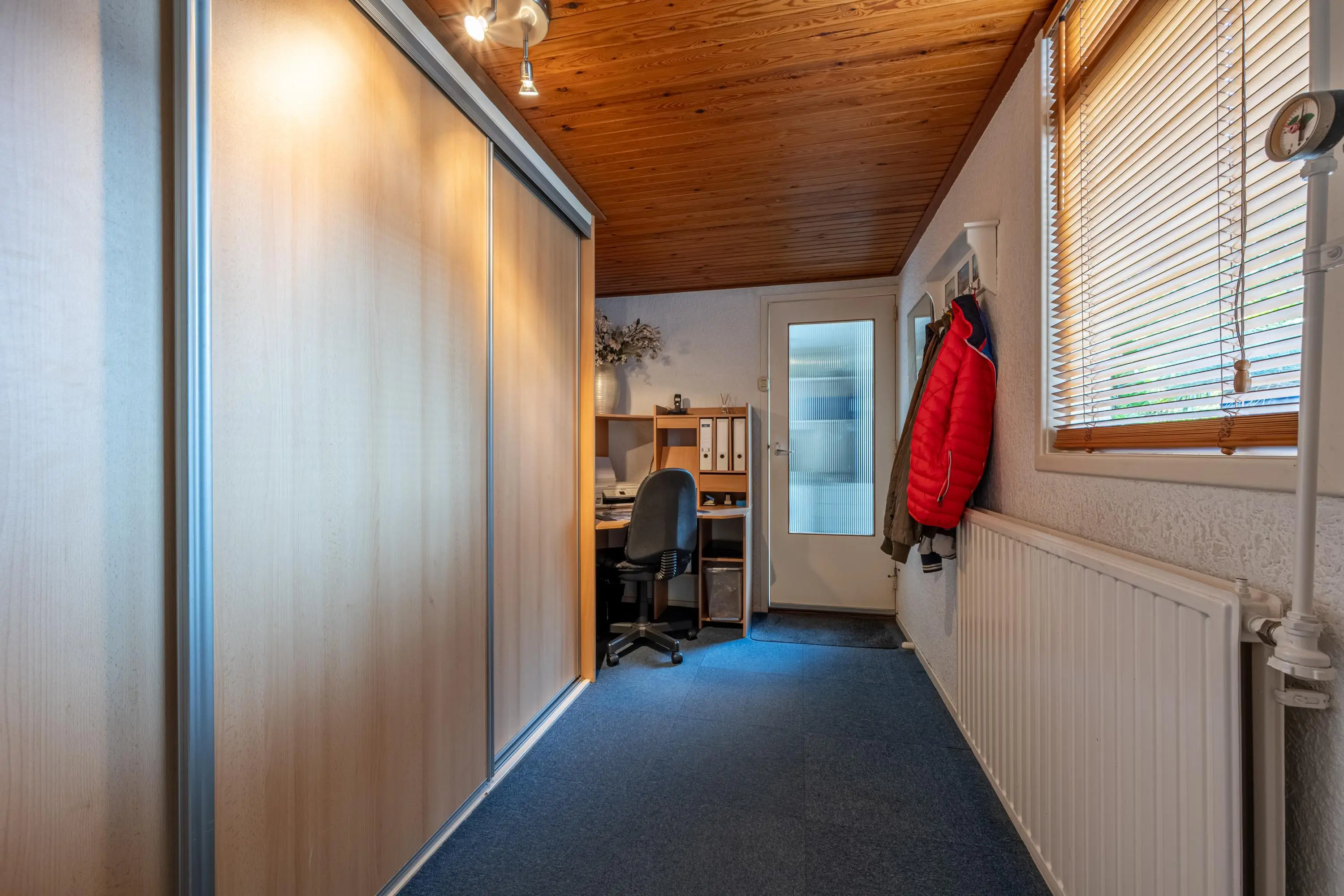 Vanuit de hal is er toegang tot een praktische werkkamer, gelegen aan de achterzijde van de woning. Deze fijne ruimte, voorzien van een schuifkastenwand, is ideaal als thuiswerkplek of hobbykamer.