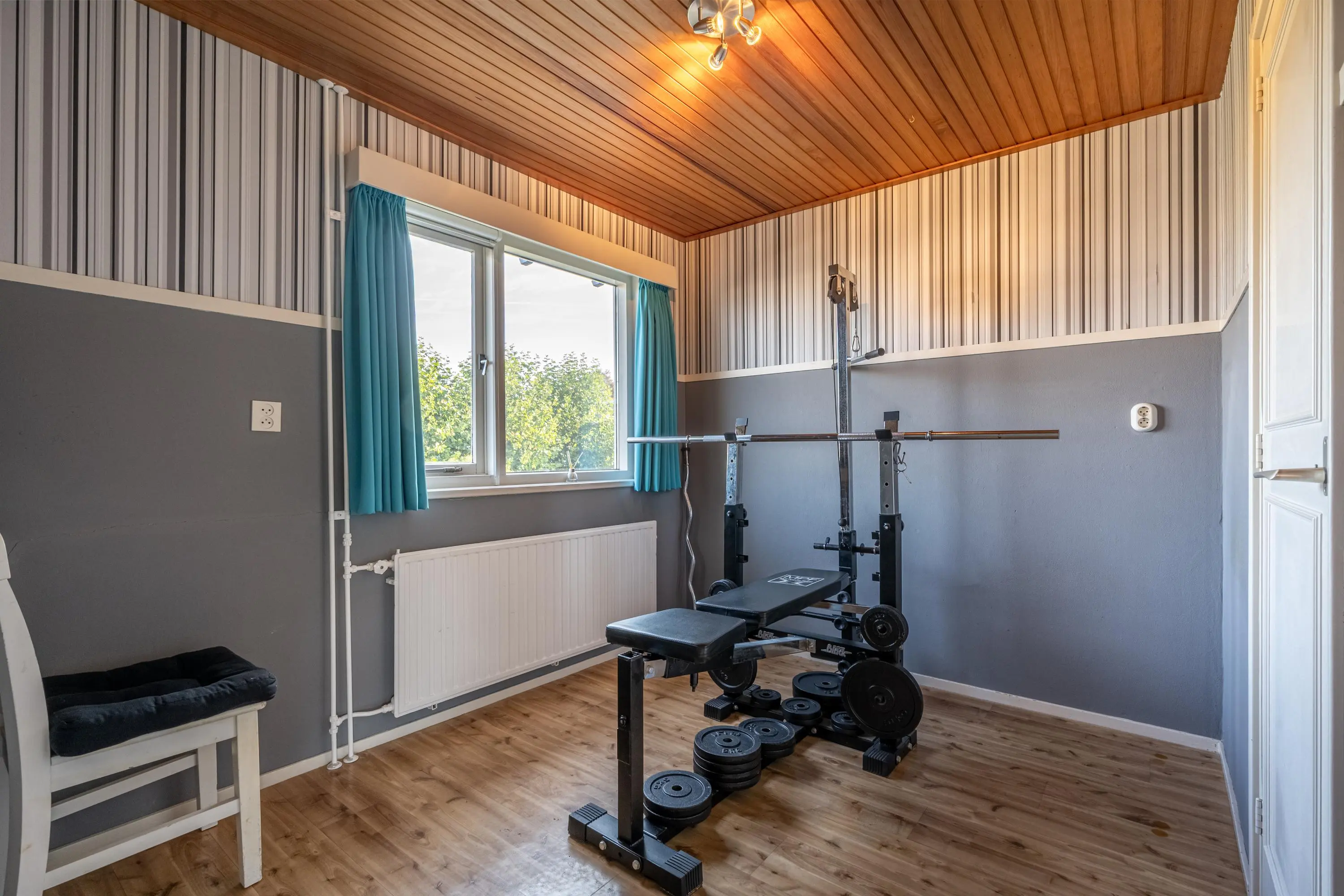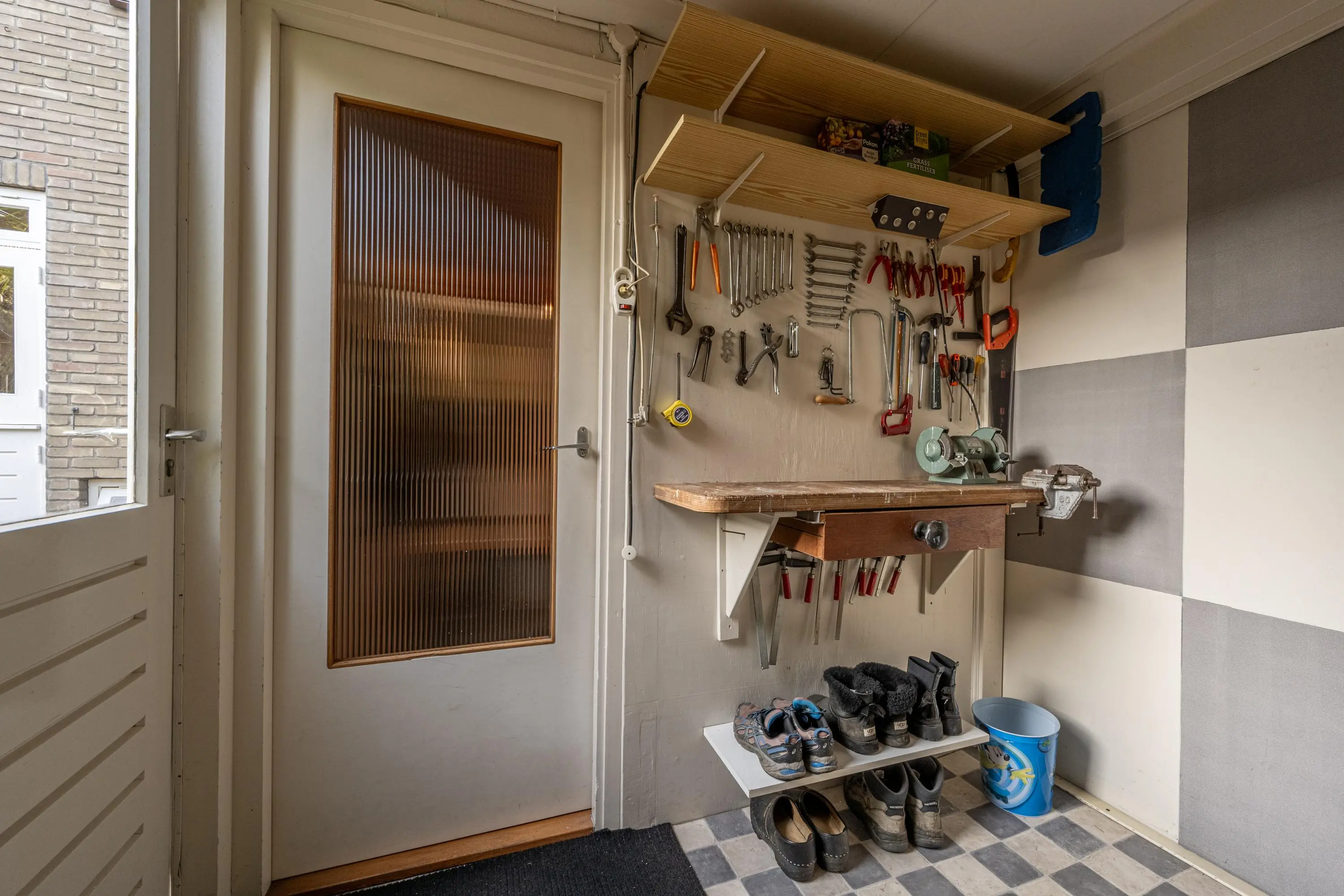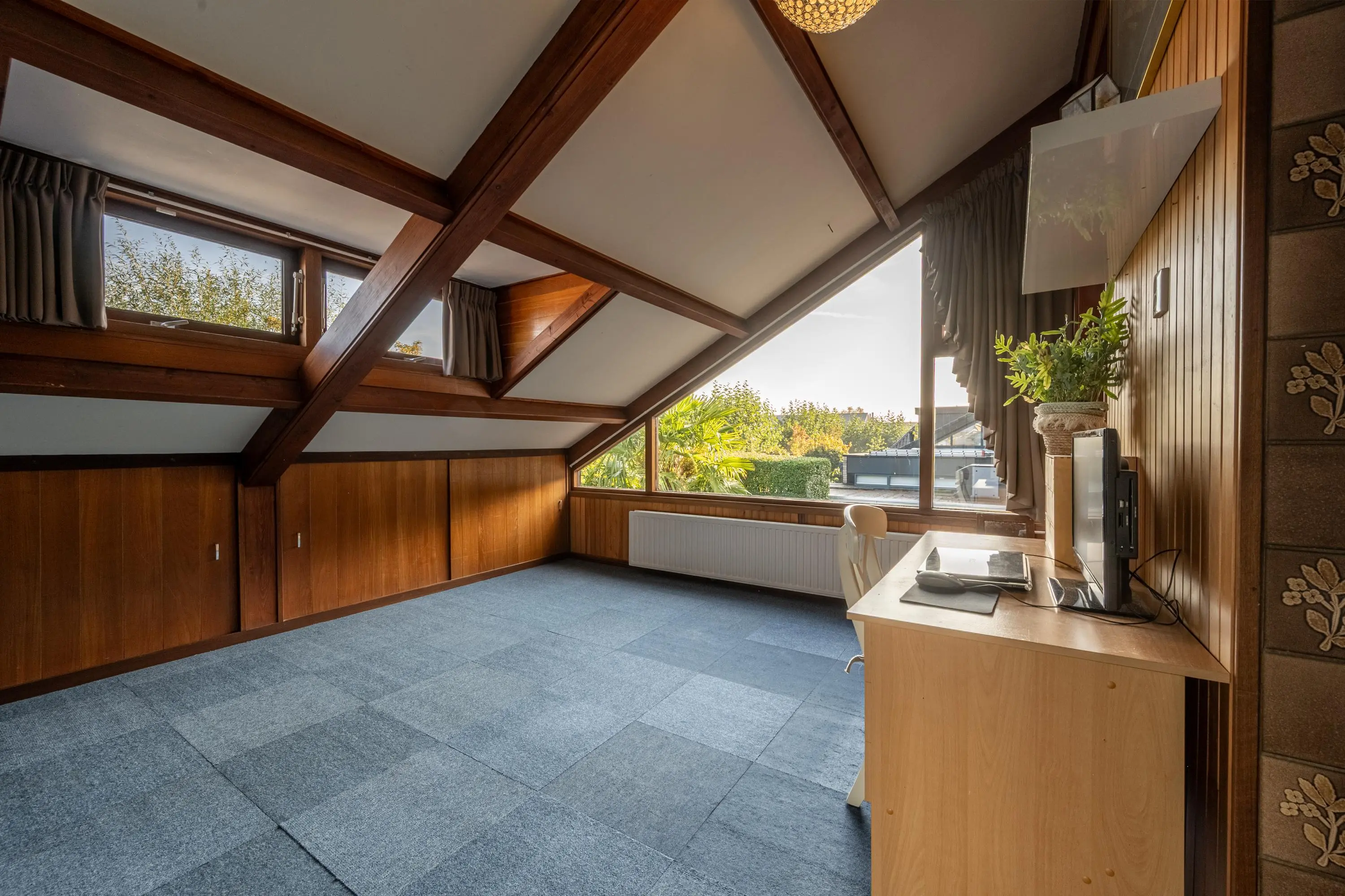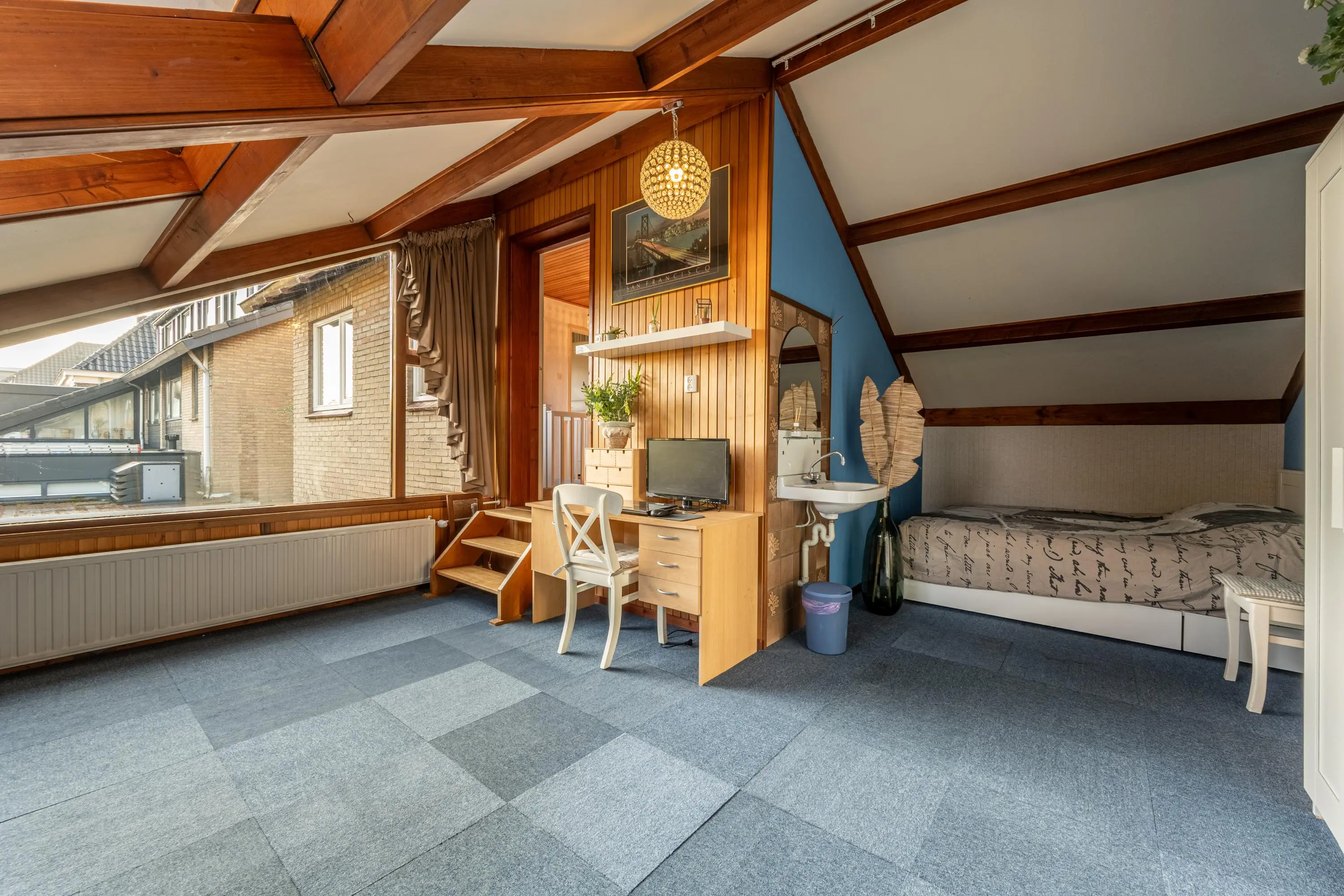 Vanuit de hal is er toegang tot een praktische werkkamer, gelegen aan de achterzijde van de woning. Deze fijne ruimte, voorzien van een schuifkastenwand, is ideaal als thuiswerkplek of hobbykamer.