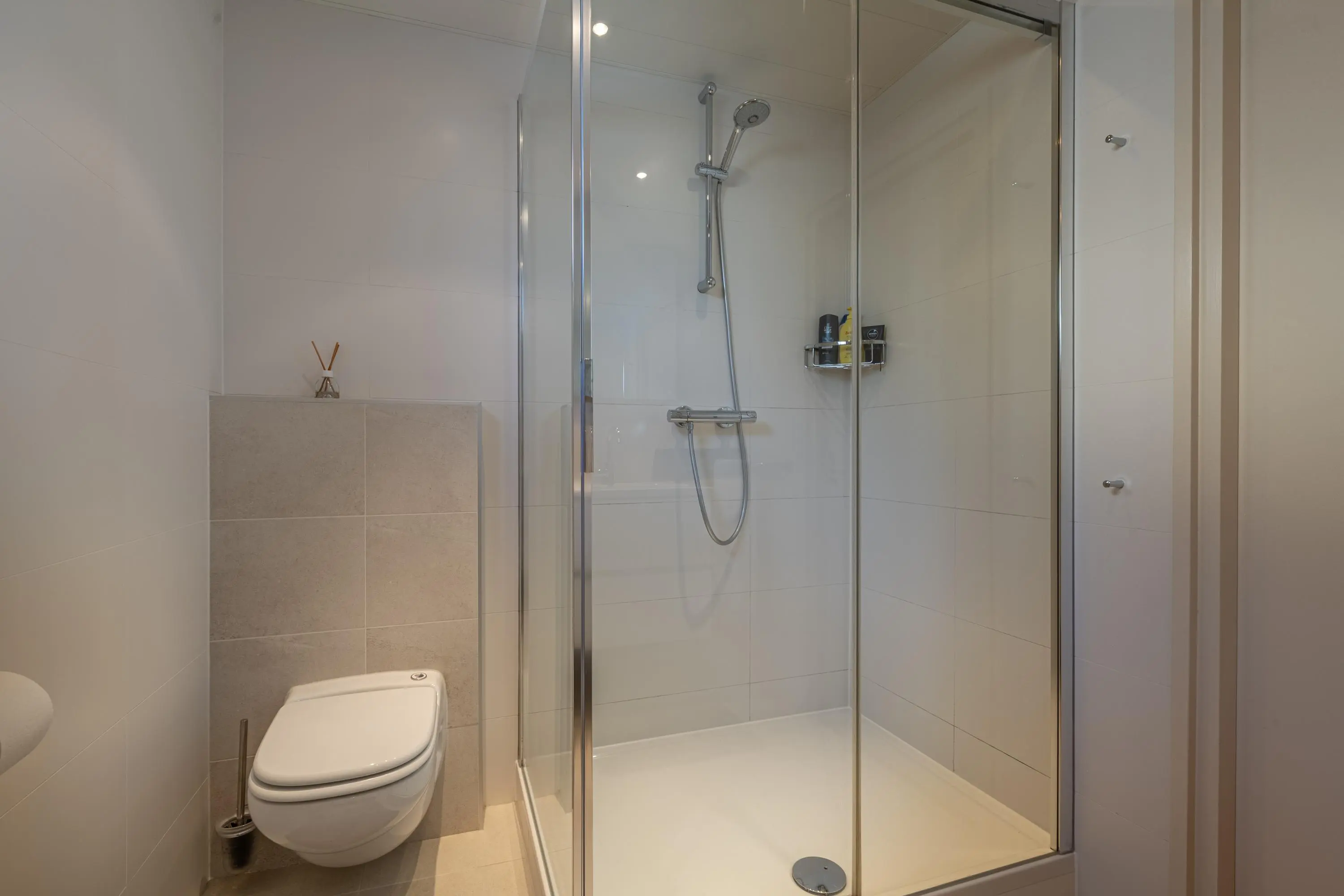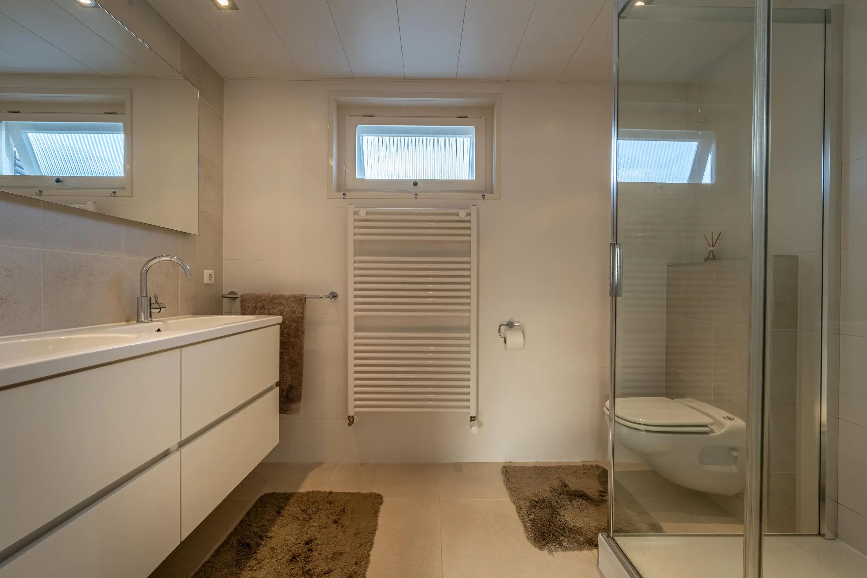 De badkamer (2014) is modern afgewerkt in een lichte kleurstelling en biedt comfort. Hetgeen beschikt over een douchecabine met glazen wanden, zwevend toilet, designradiator en een fraai wastafelmeubel met dubbele wastafels.